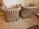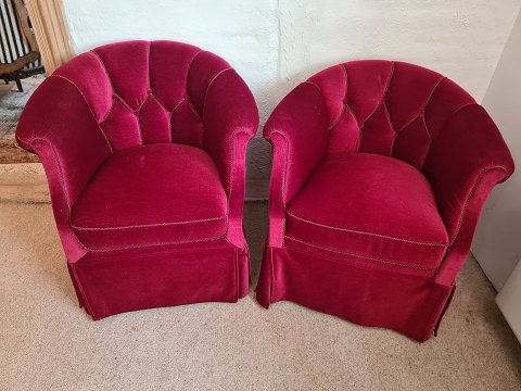 Par overpolstrede lænestole fra 1950'erne. Fremstår pæne og velholdte uden nævneværdige brugsspor. Højde 70 cm. Bredde 70 cm. Dybde 68 cm. Sædehøjde 42 cm. Emne nummer: 80901