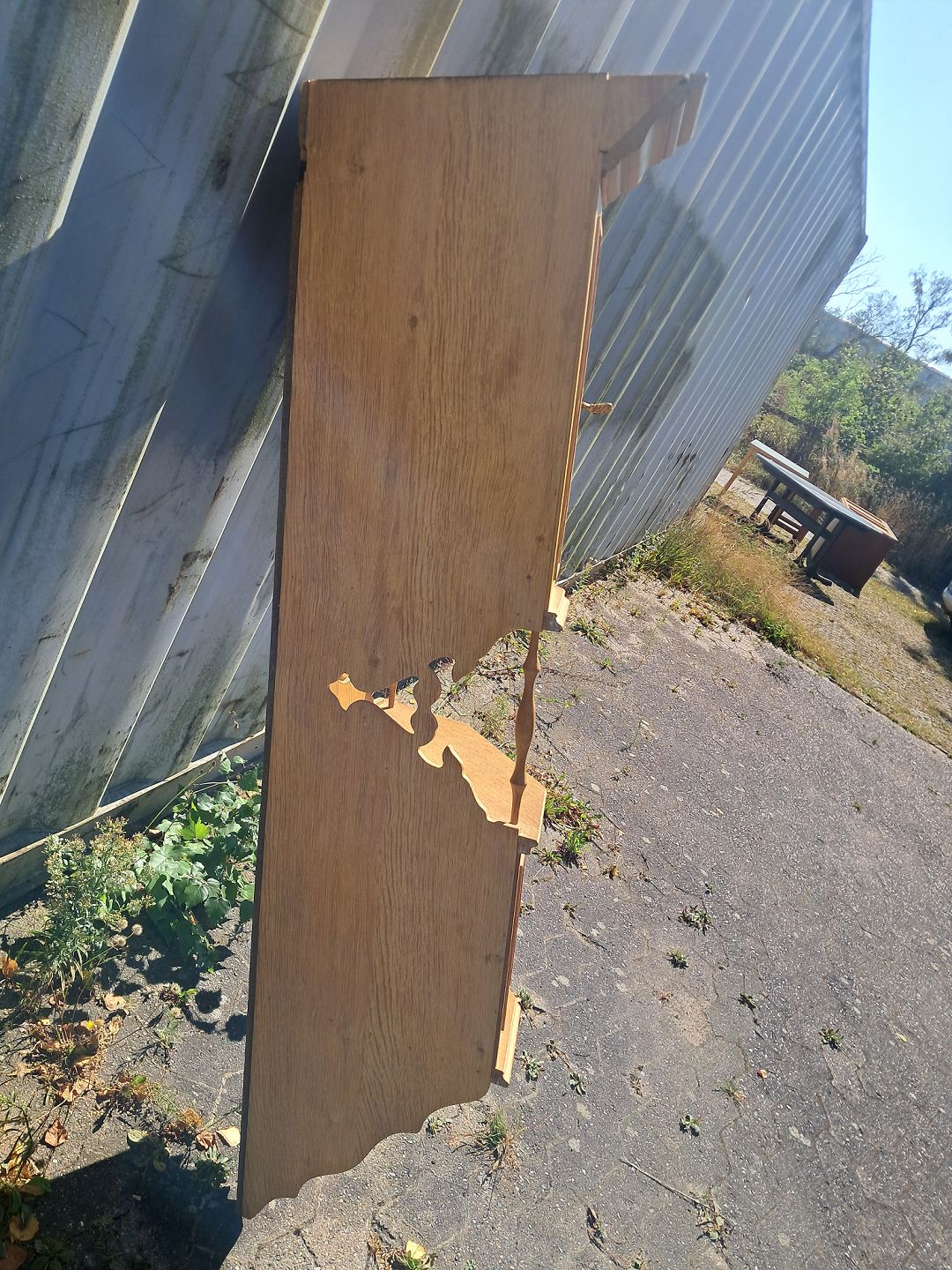 Væg-hjørneskab i fineret egetræ, fra 1980erne. Det har brugsspor. Højde 156cm Bredde 64cm Dybder 47cm Emne nummer: 77138