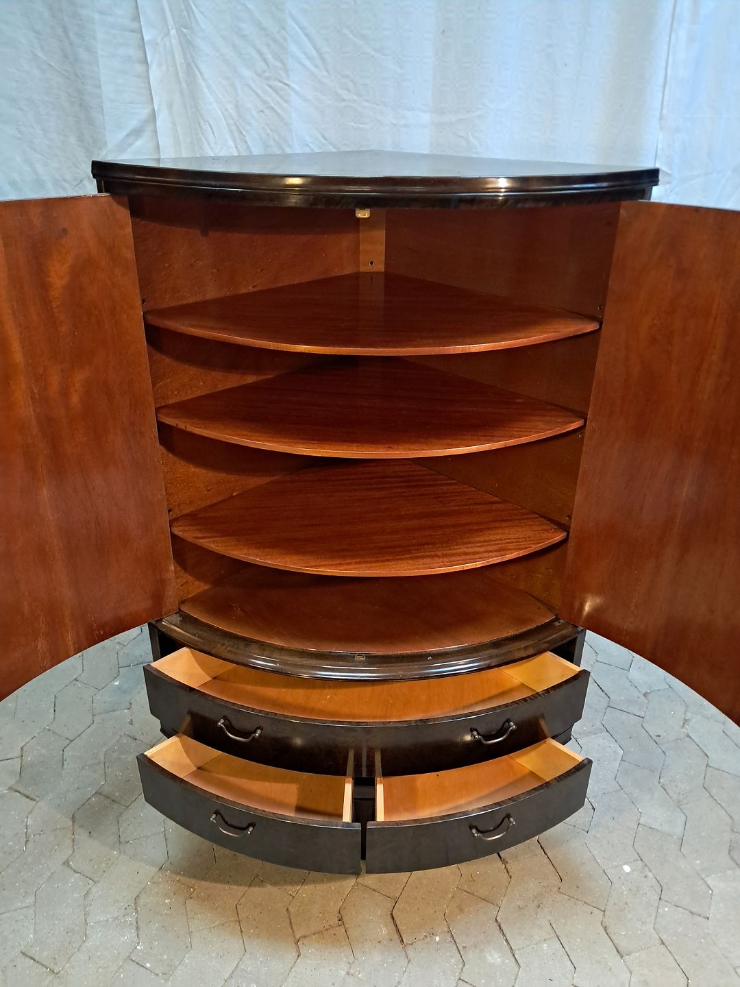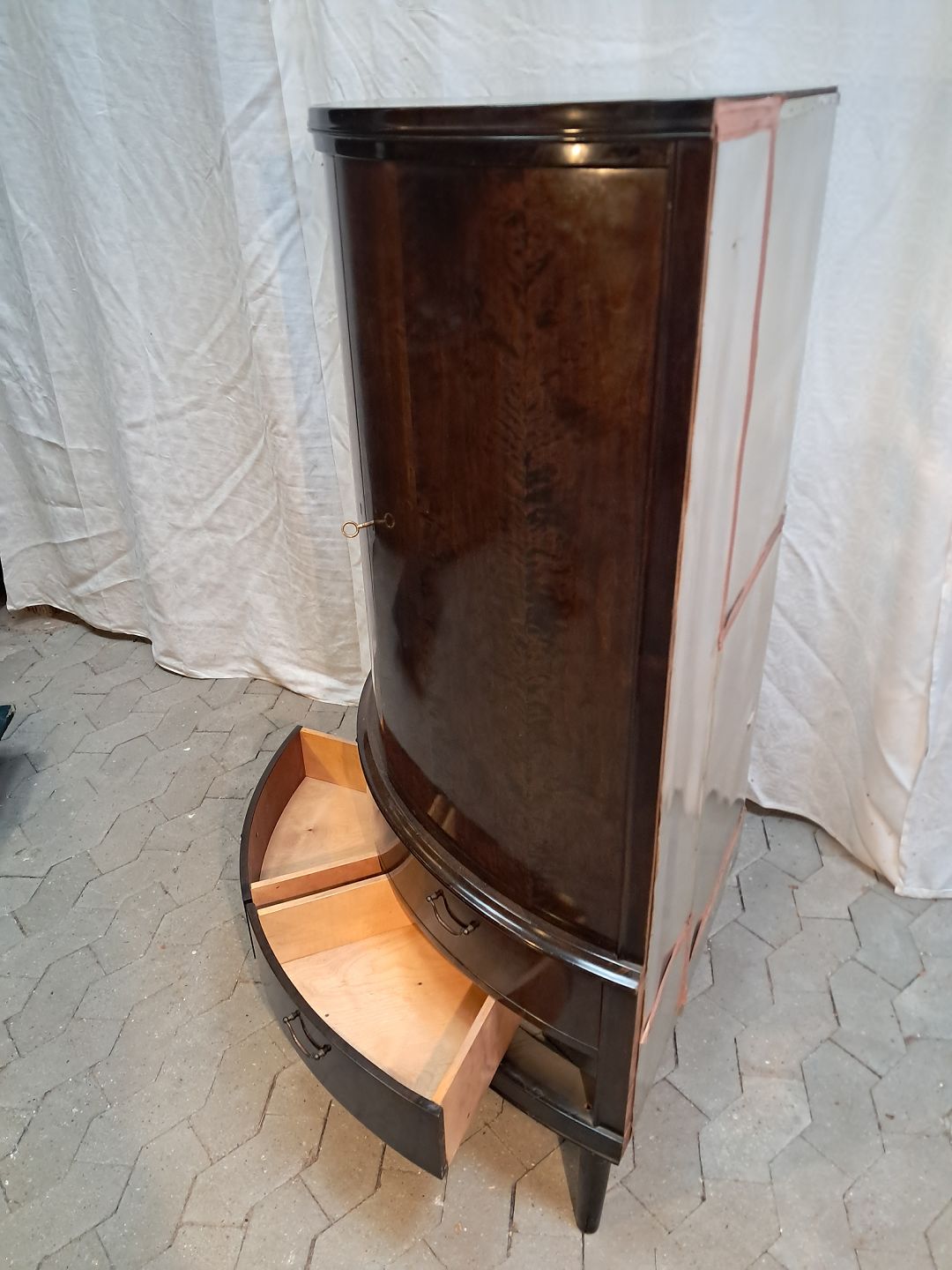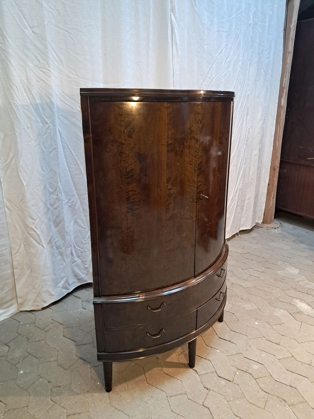 Hjørneskab i fineret birketræ, fra 1950erne. Det har brugsspor. Højde 136cm Bredde 90cm Dybder 63cm Emne nummer: 91915