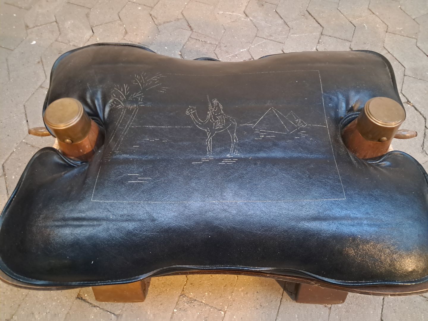 Skammel i massivt træ med kunstlæder hynde, fra 1980erne. Den har brugsspor. Højde 38cm Bredde 40cm Længde 61cm Emne nummer: 91924
