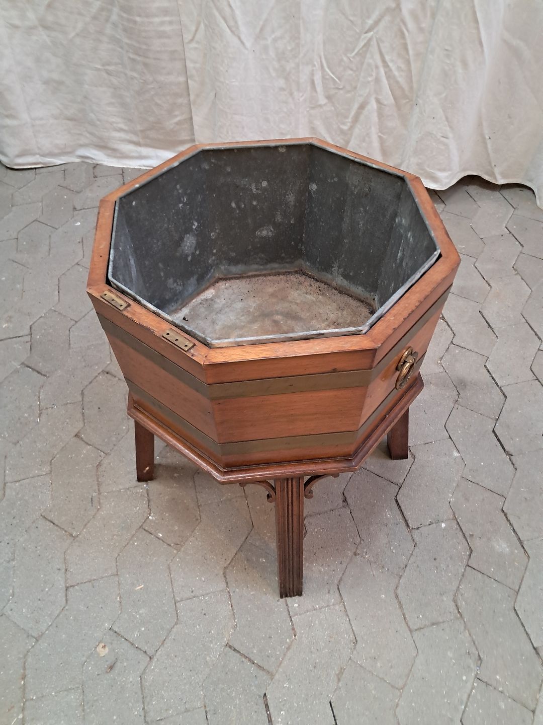 Plantekasse i mahogni med zinkspand, fra 1960erne. Den har brugsspor. Højde 60cm Diameter 47cm Emne nummer: 91944