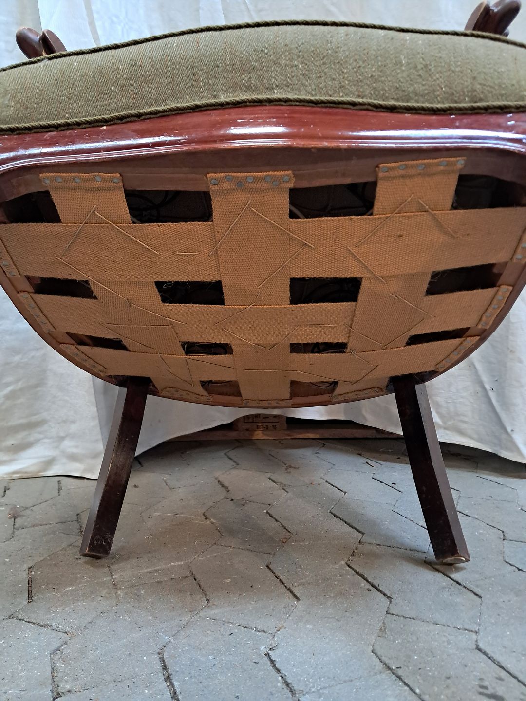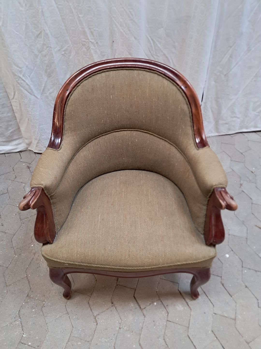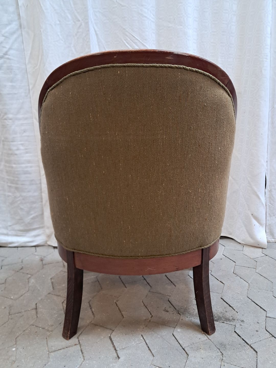 Lænestol i mahogni med uldbetræk, fra 1910erne. Den har brugsspor. Ryghøjde 86cm Sædehøjde 43cm Emne nummer: 91948