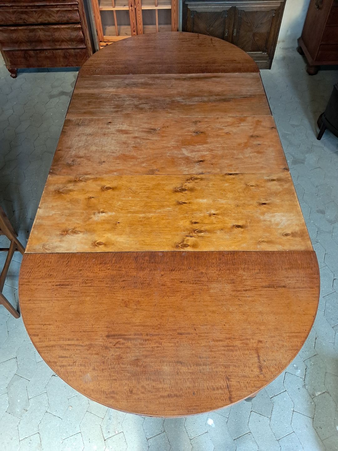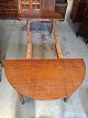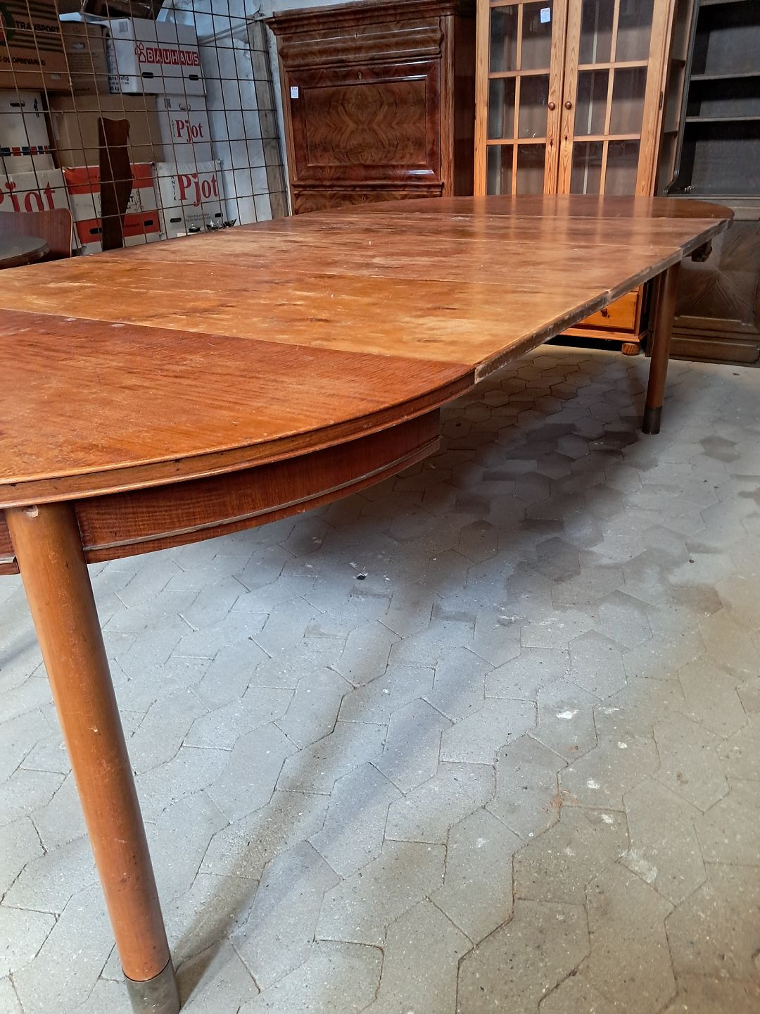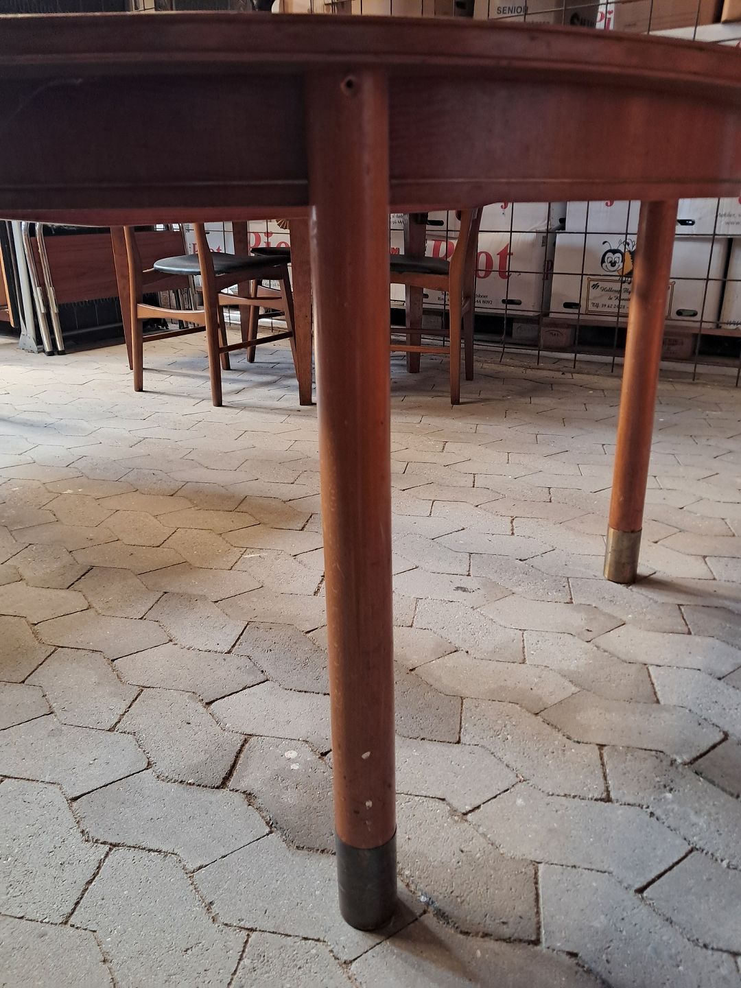 Spisebord i fineret mahogni med 3 tillægsplader, fra 1950erne. Det har brugsspor. Højde 76cm Diameter 130cm Længde med tillægsplader 280cm Emne nummer: 91955