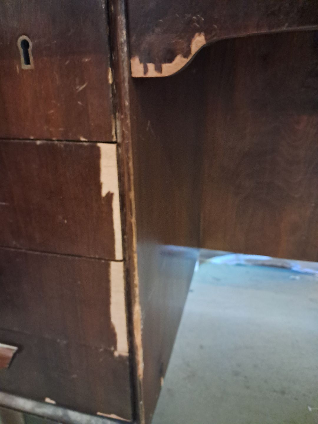 Skrivebord i fineret nødetræ, fra 1960erne. Den har brugsspor. Højde 72cm Bredde 140cm Dybde 66cm Højde fra gulv til underkant 66cm Emne nummer: 77219