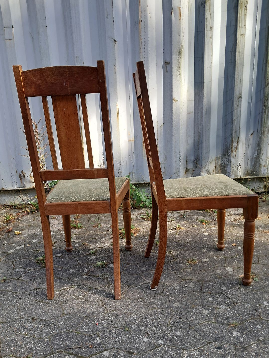 2 Stole i massivt egetræ, fra 1910erne. De har bruggspor. Ryghøjde 105cm Sædehøjde 47cm Emne nummer: 77236