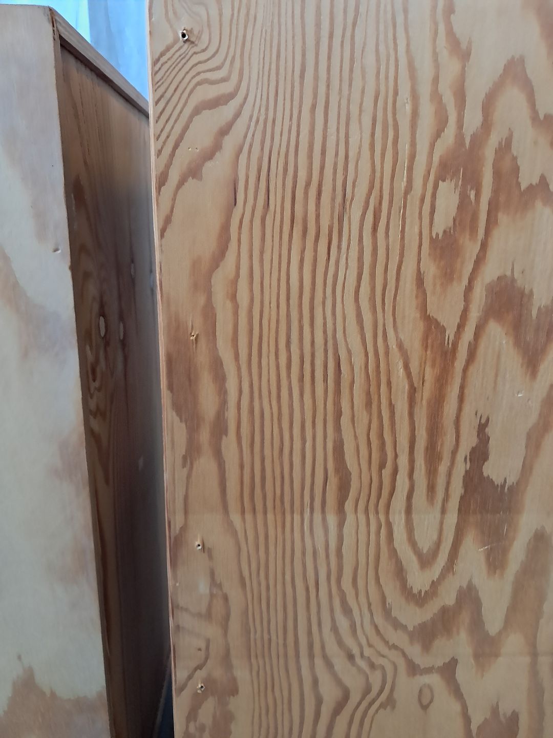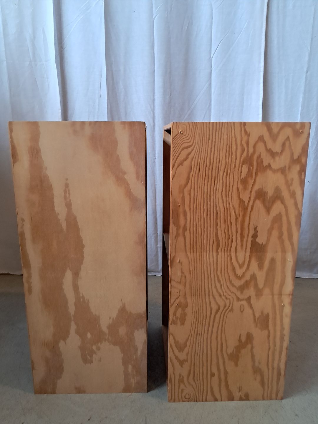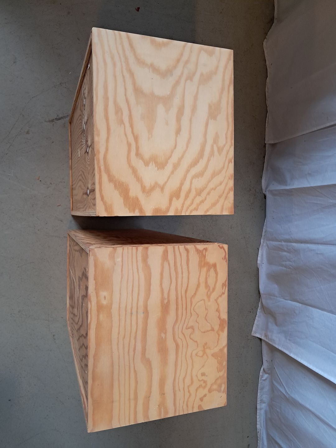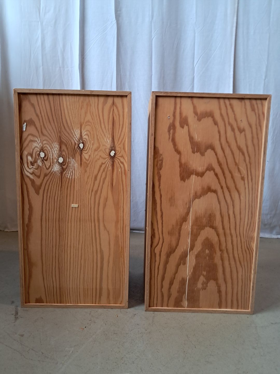 2 Reolkasser i krydsfiner, fra 2000erne. De har brugsspor og der medfølger ikke ophæng. Højde 70cm Bredde 35,5cm Dybde 30cm Emne nummer: 77259