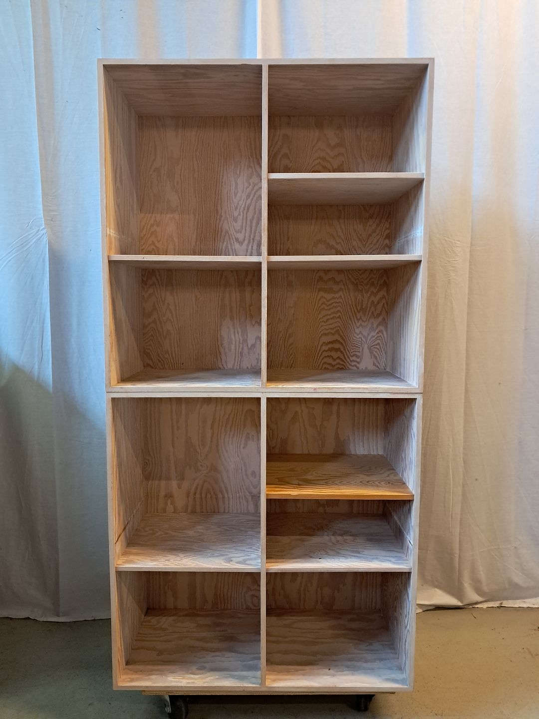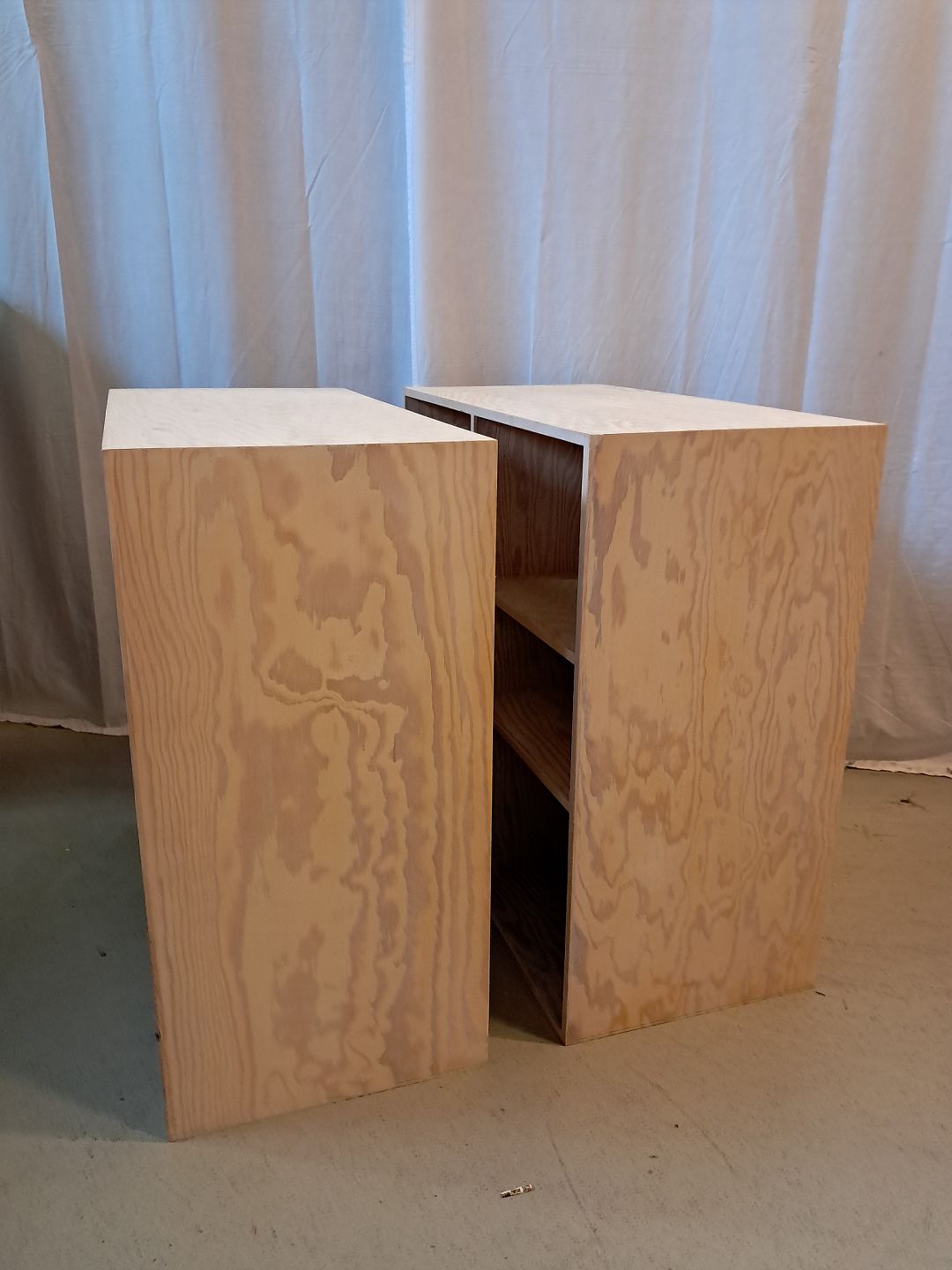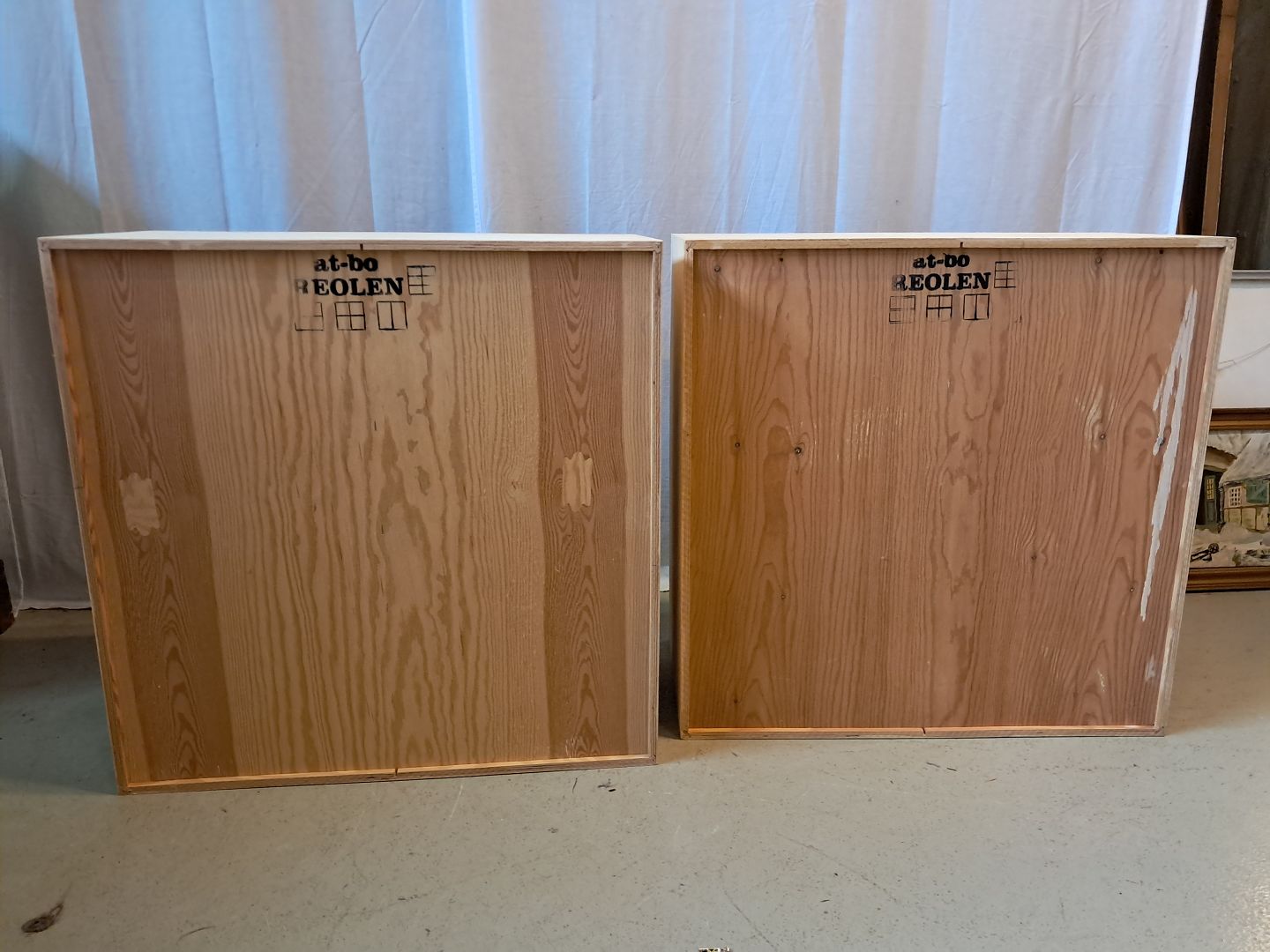 2 At-Bo reolkasser i krydsfiner, fra 2000erne. De har brugsspor og der medfølger ikke ophæng. Højde 70cm Bredde 70cm Dybde 34cm Emne nummer: 77282