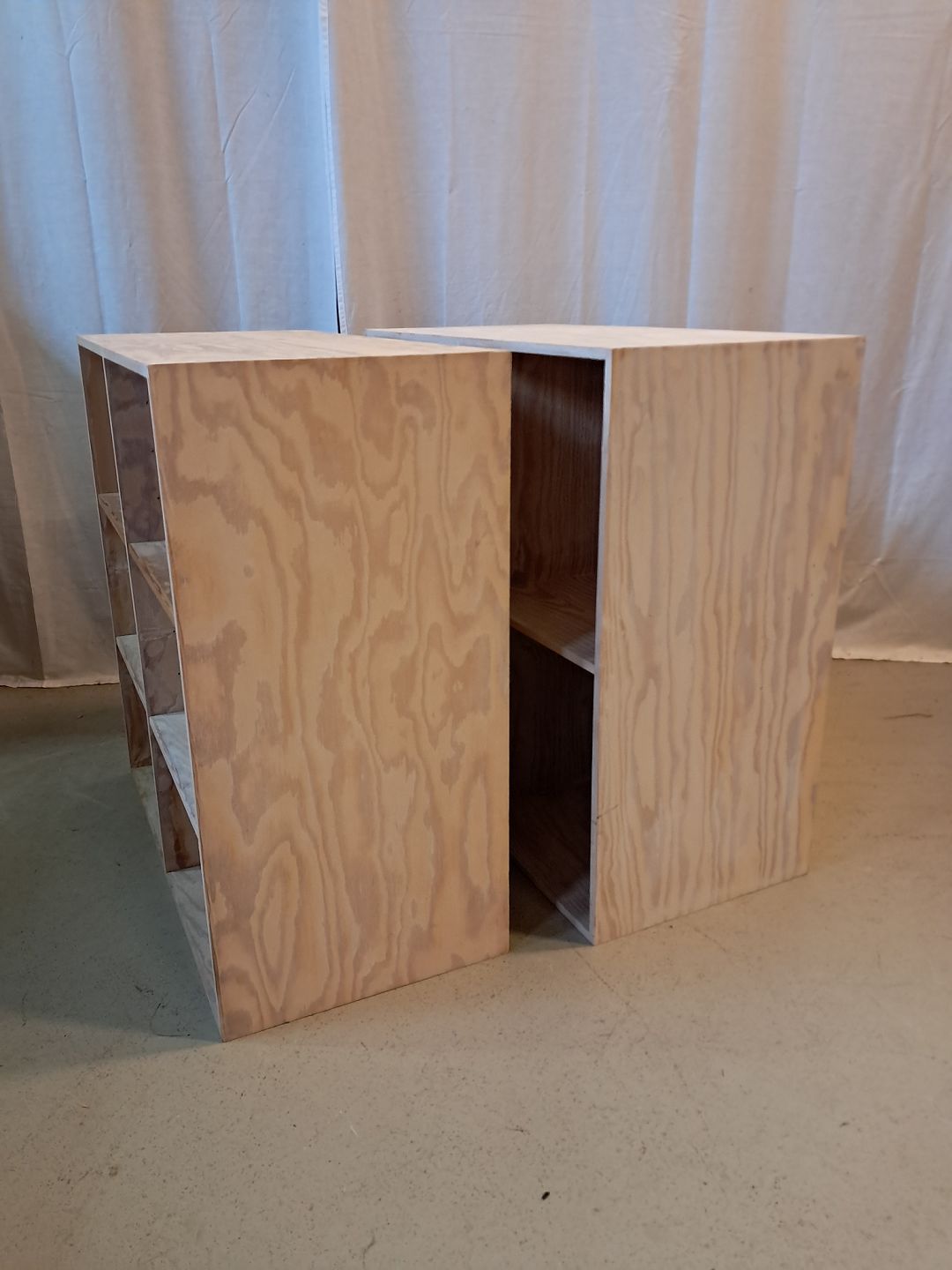 2 At-Bo reolkasser i krydsfiner, fra 2000erne. De har brugsspor og der medfølger ikke ophæng. Højde 70cm Bredde 70cm Dybde 34cm Emne nummer: 77284