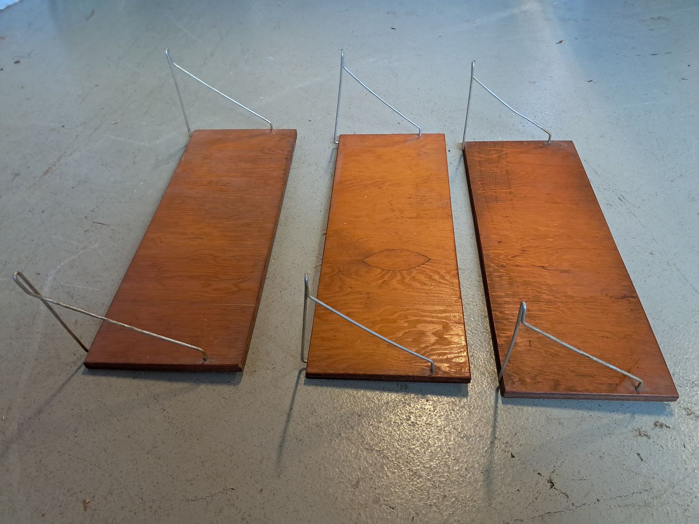 3 Hylder i fkrydsfiner, fra 1960erne. De har brugsspor. Højde 20cm Bredde 60cm Dybde 23cm Emne nummer: 77294