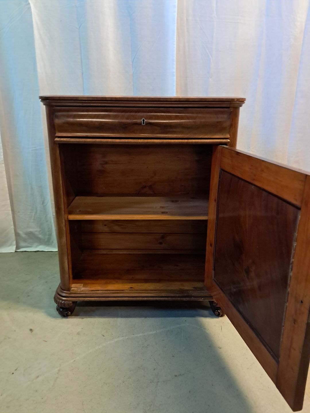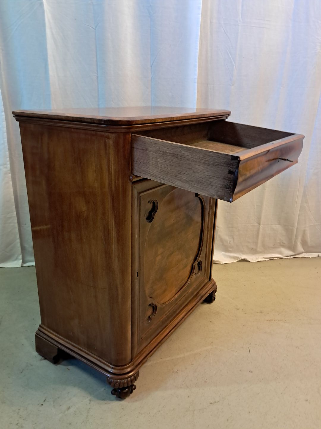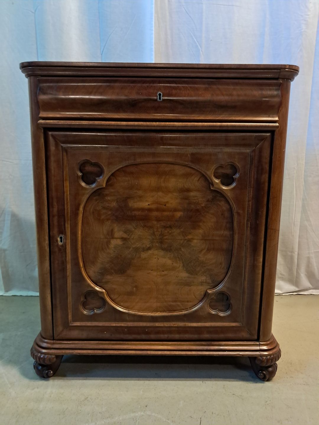 Skab i fineret mahogni, fra 1900erne. Det har brugsspor. Højde 84cm Bredde 69cm Dybde 39cm Emne nummer: 77297