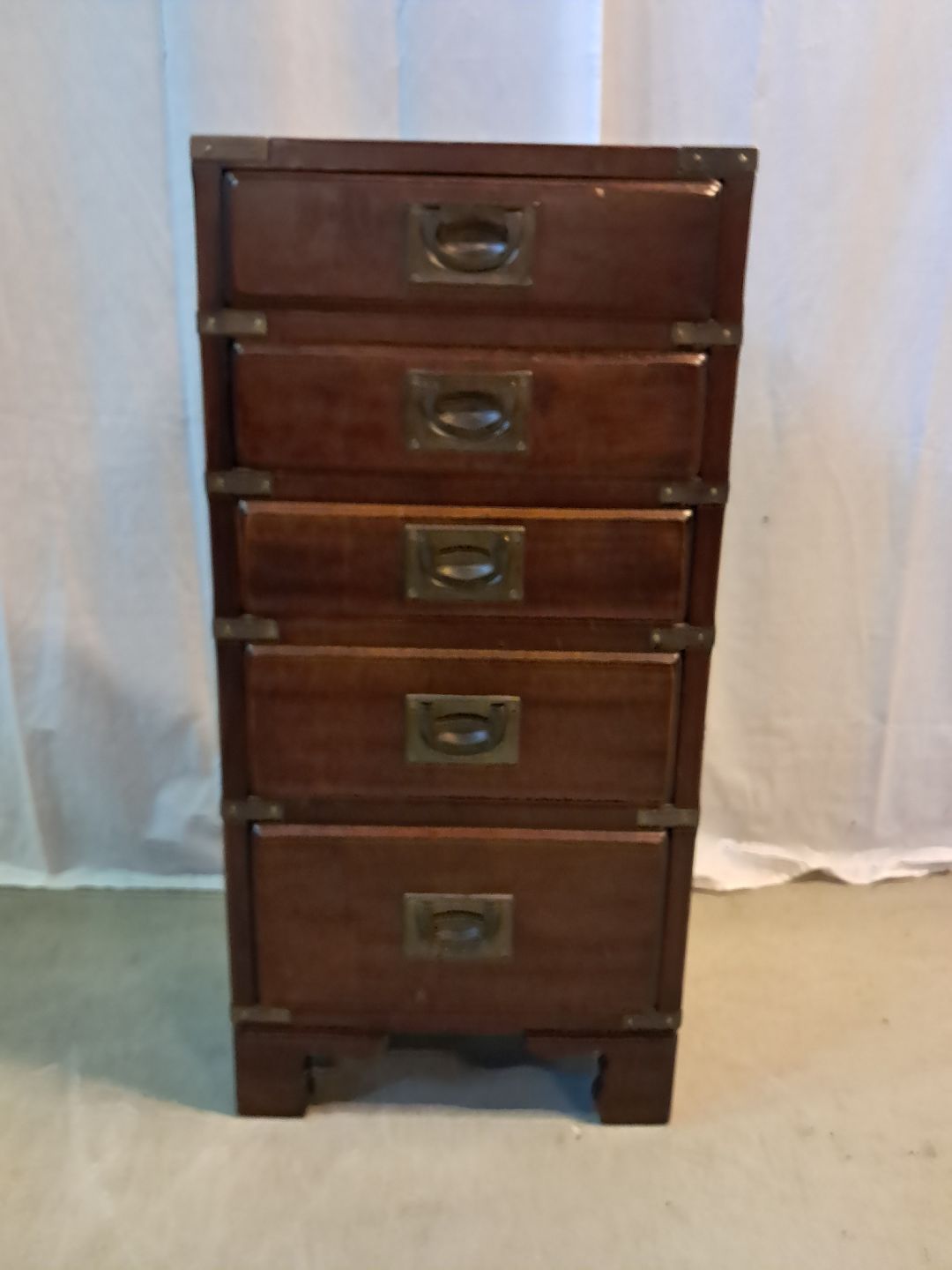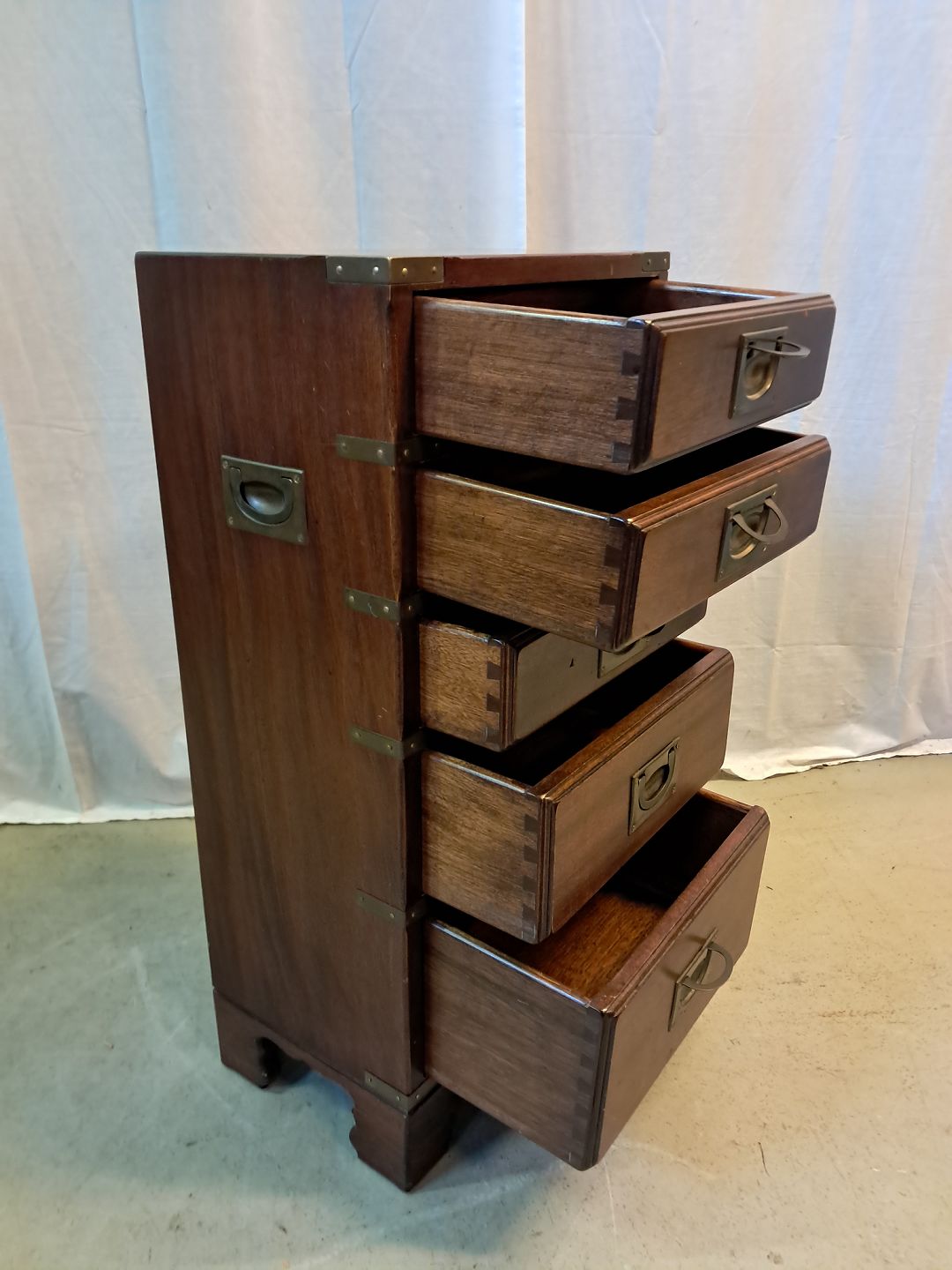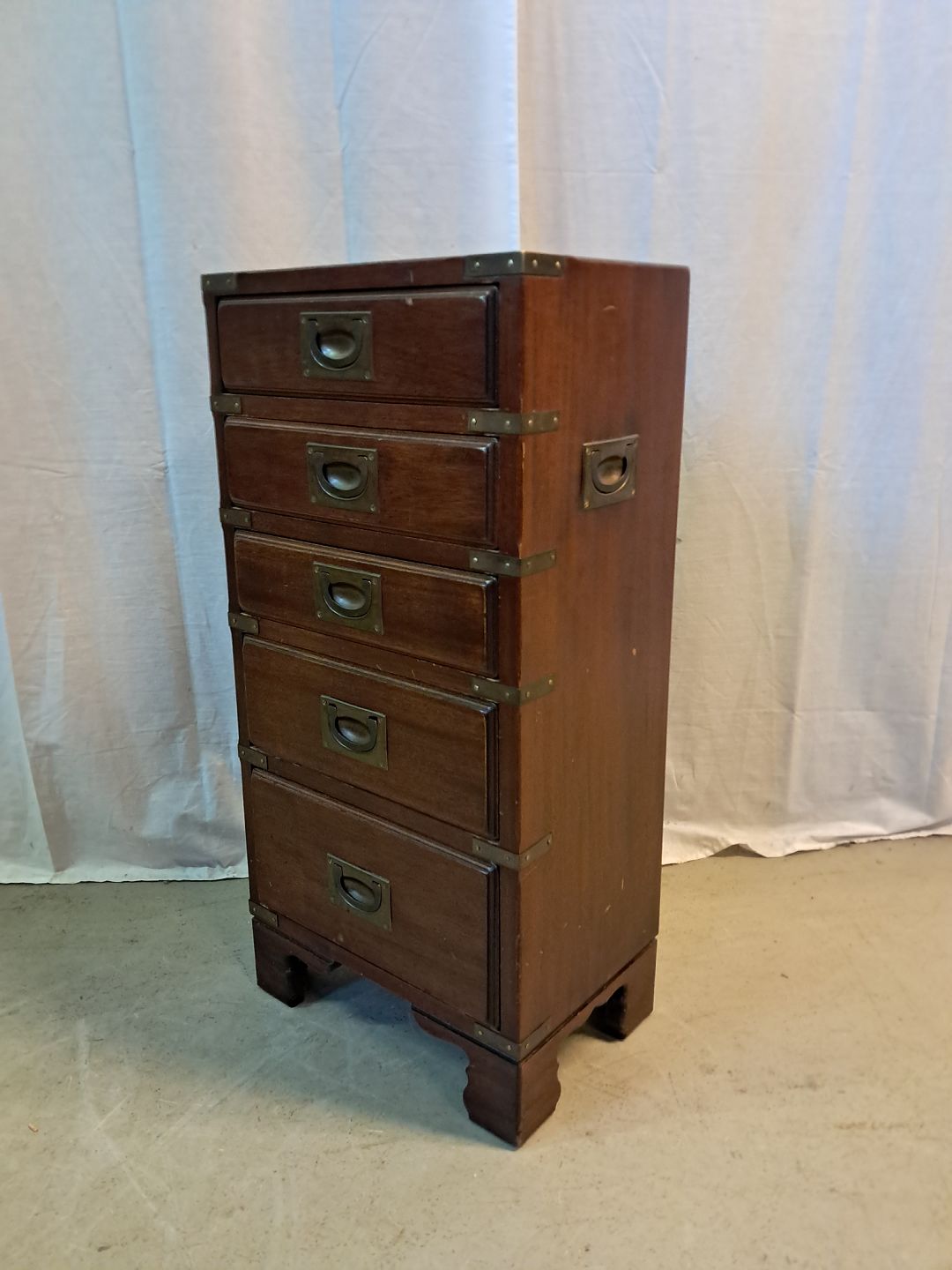 Military kommode i massivt mahogni, fra 1980erne. Den har brugsspor. Højde 79cm Bredde 38cm Dybde 26cm Emne nummer: 77299
