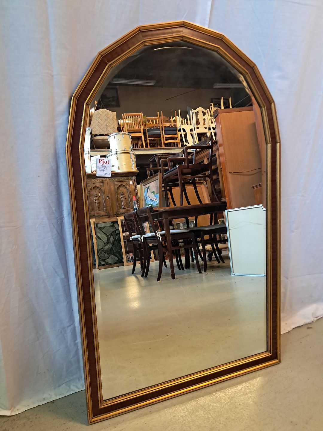 Facetslebet spejl i fineret mahogni og guldmalet ramme, fra 1980erne. Det har brugsspor. Højde 113cm Bredde 70cm Emne nummer: 77335