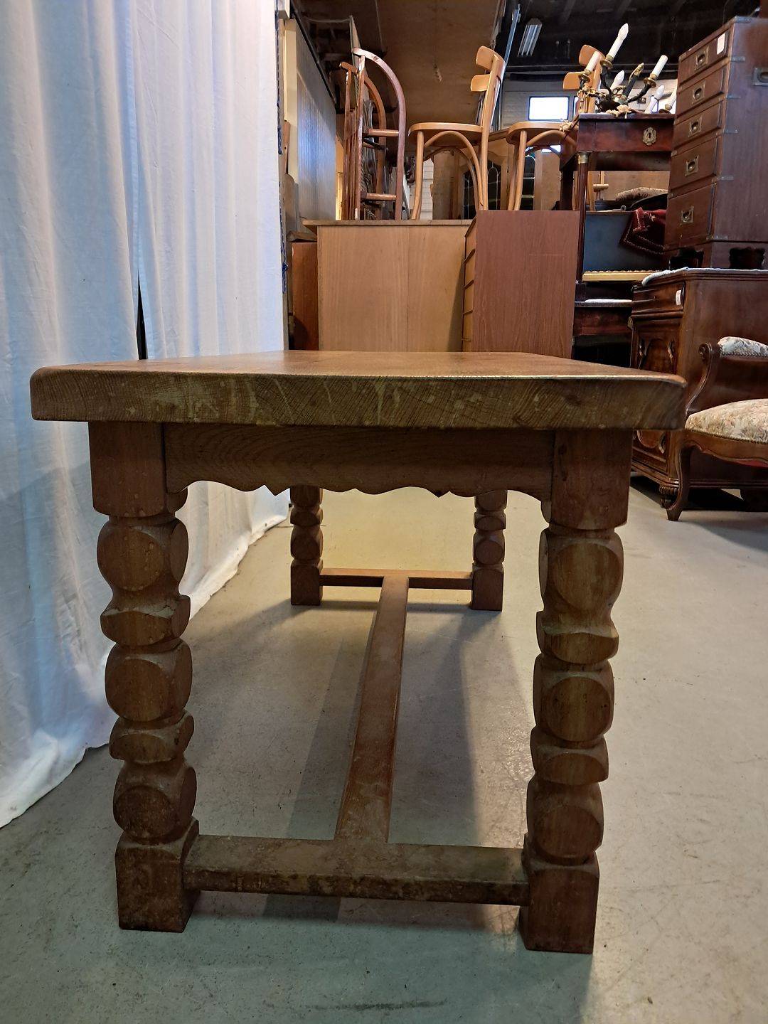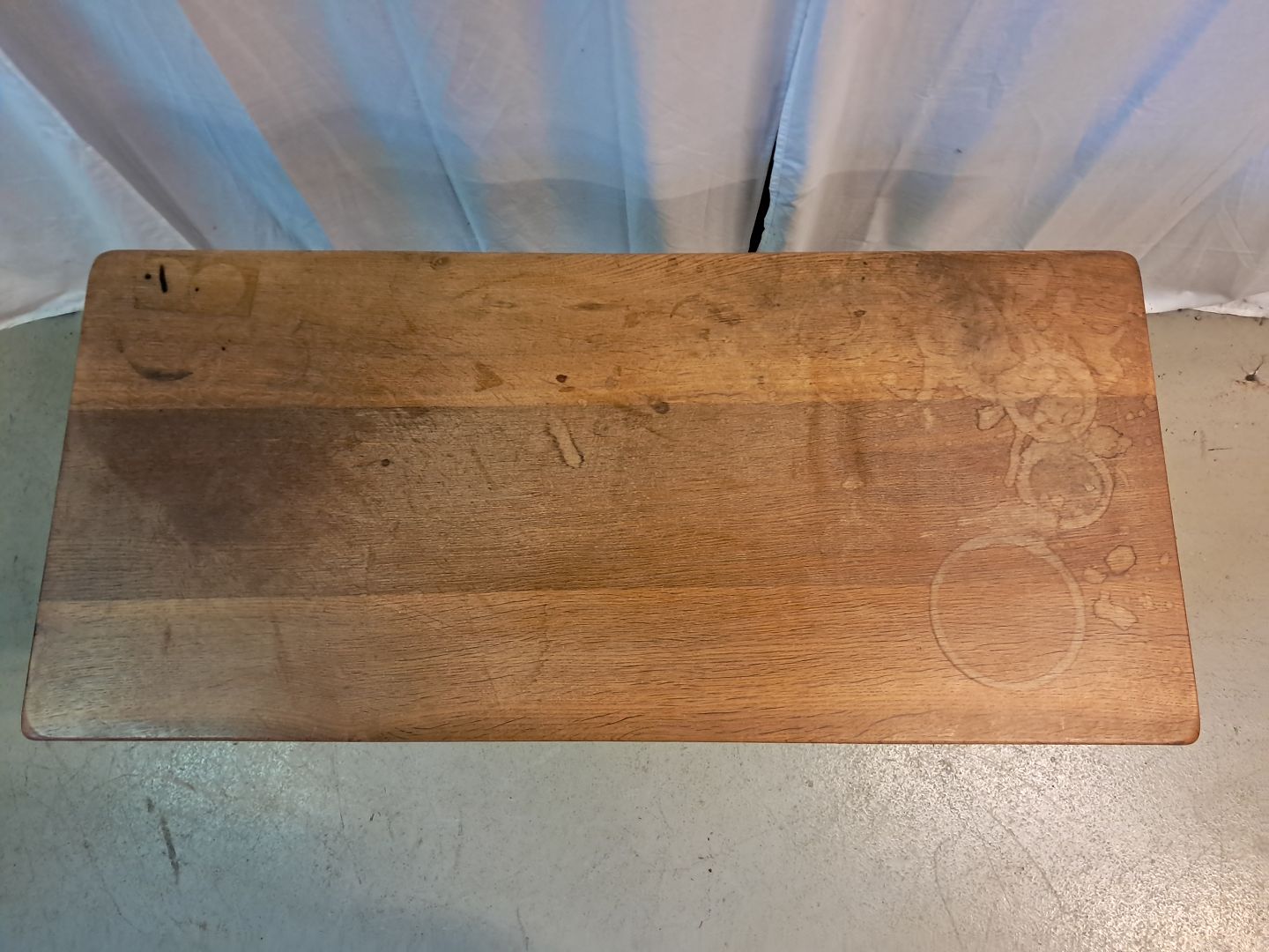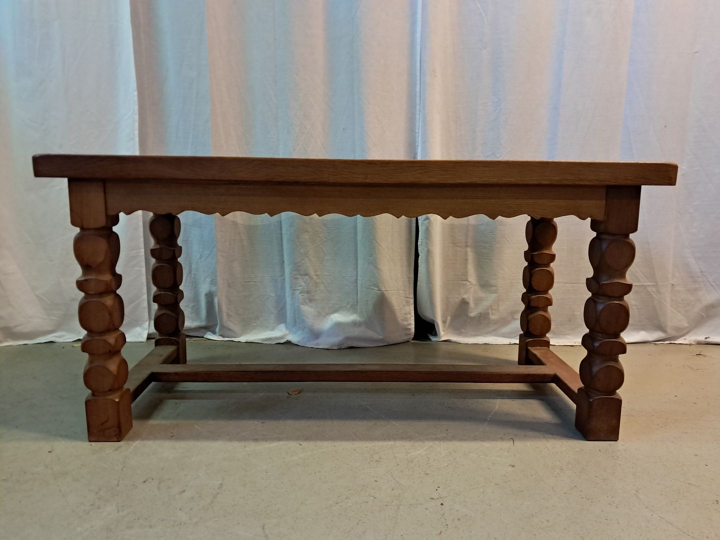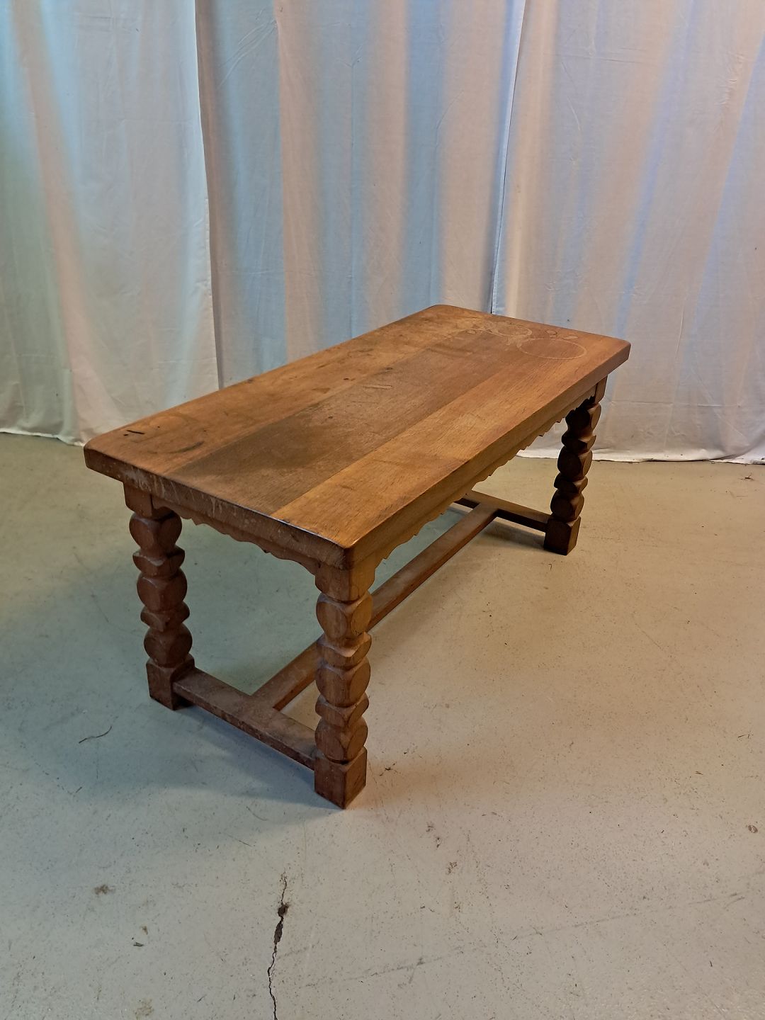 Sofabord i massivt egetræ, fra 1980erne. Det har brugsspor og et brændemærke. Højde 58cm Bredde 54cm Længde 120cm Plade tykkelse 4,5cm Emne nummer: 77408