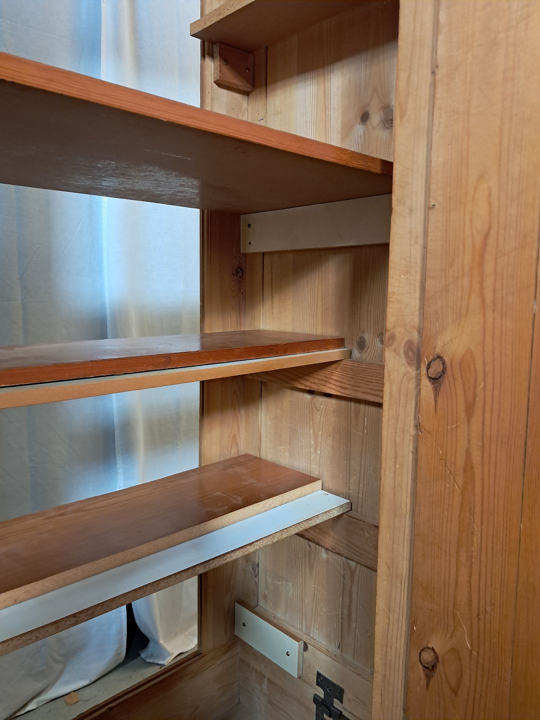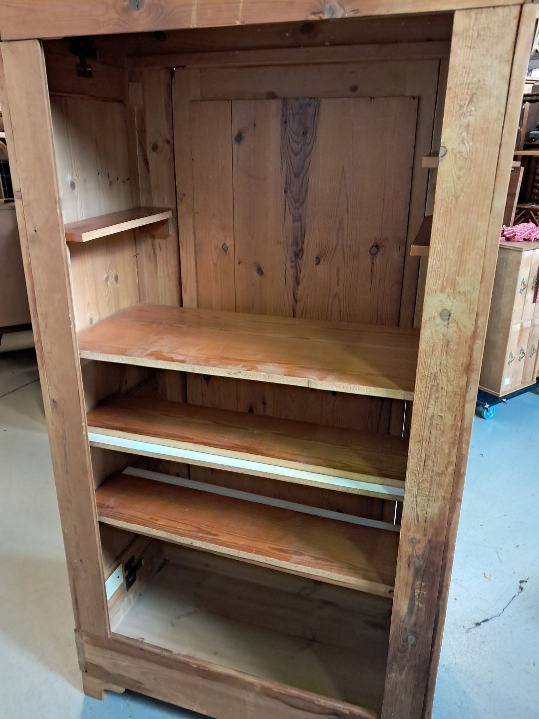 Skab i massivt fyrretræ, fra 1920erne. Det har brugsspor og mangler bagbeklædning, det lugter af tobak og skal vaskes ned. Højde 202cm Bredde 100cm Dybde 54cm Emne nummer: 77424