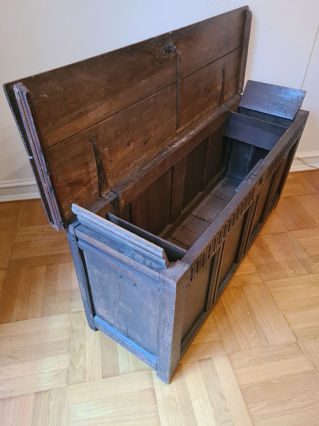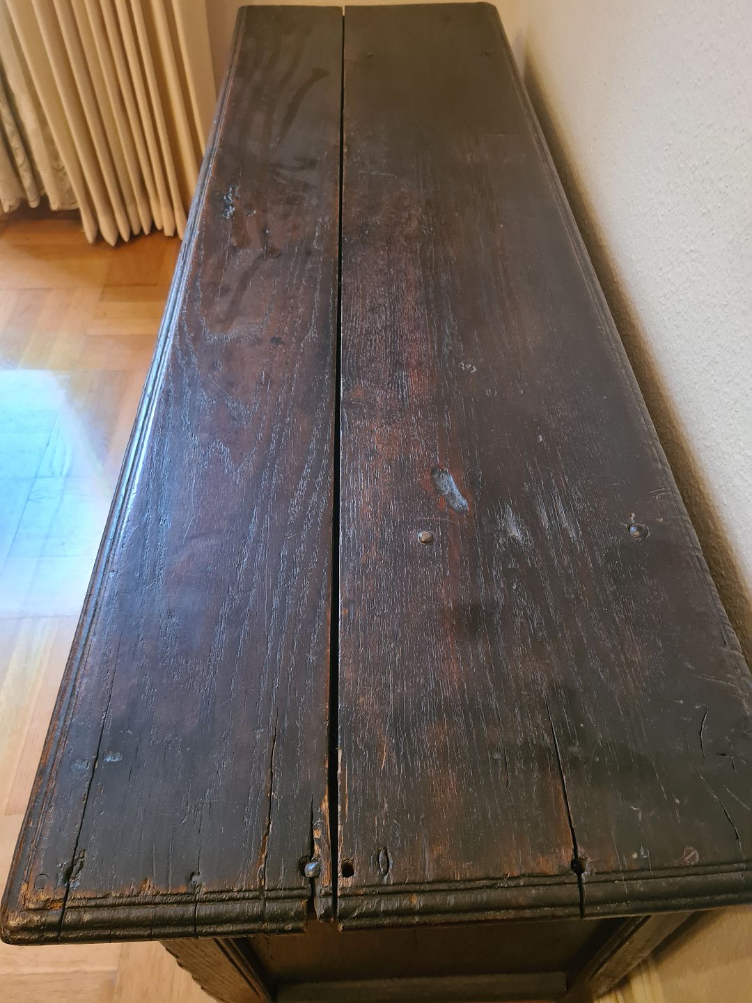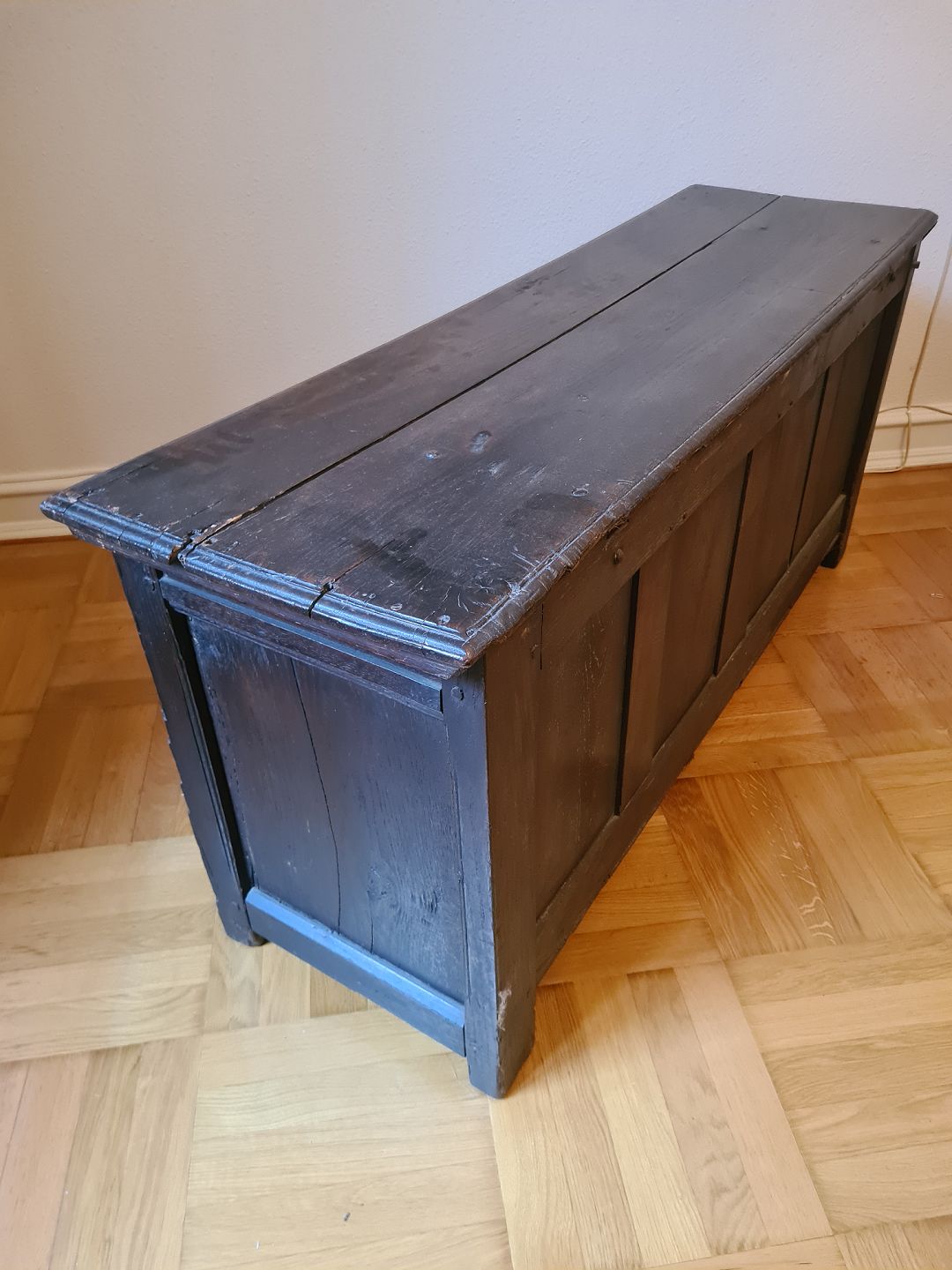 Brudekiste fra 1800 tallet i eg. Fremstår god, robust og ganske pæn for alderen. Højde 62 cm. Bredde 138 cm. Dybde 44 cm. Emne nummer: 93002