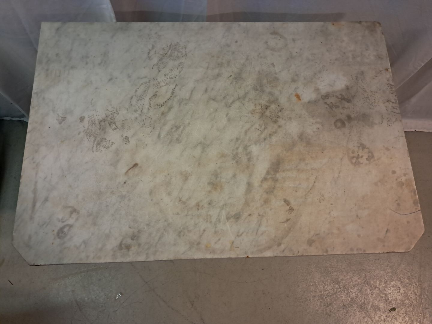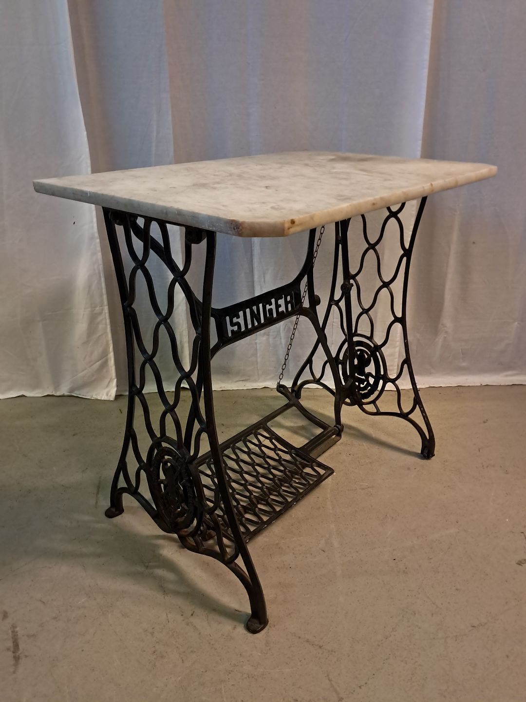 Singer symaskine-understel i metal med marmorplade, fra 1920erne. Det har brugsspor. Højde 74cm Bredde 75cm Dybde 52cm Emne nummer: 77456