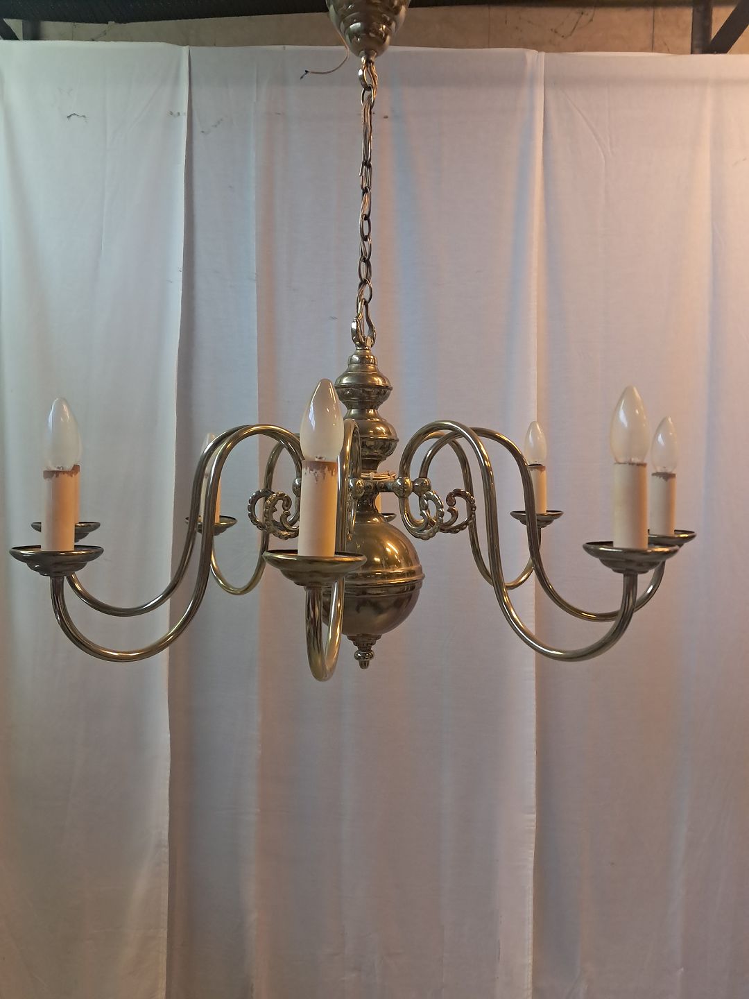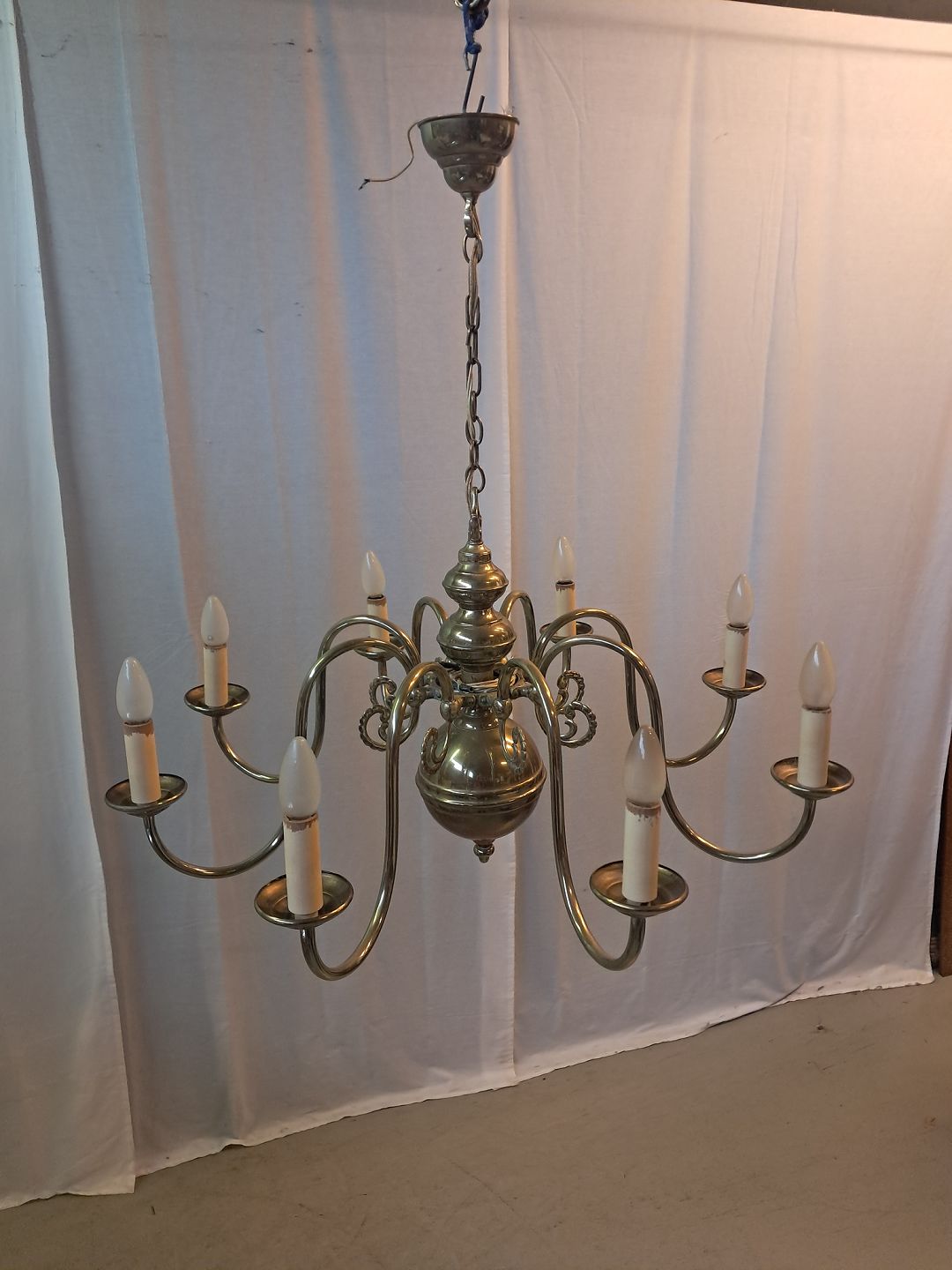 Stor kirkekrone i messing, fra 1930erne. Den har patina. Højde med kæde 85cm Diameter 86cm Emne nummer: 77461