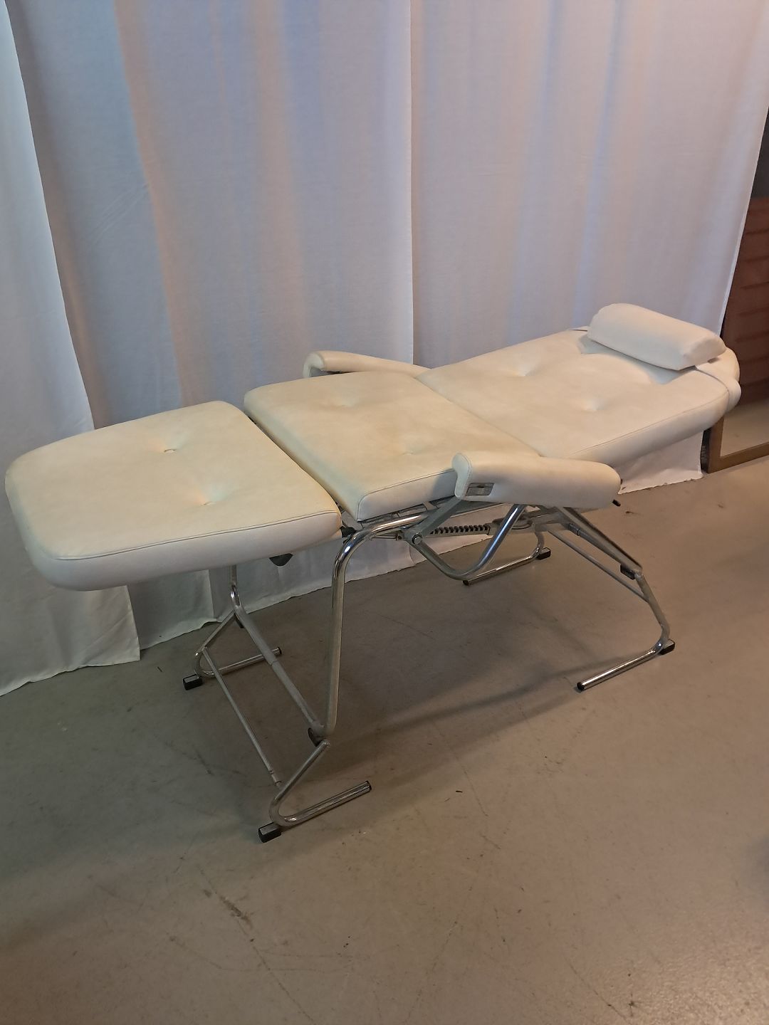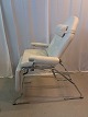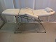 Massagse-stol og briks i metal og kunstlæder, fra 1990erne. Den har brugsspor. Højde 80cm Bredde 75cm Længde 165cm Emne nummer: 77462