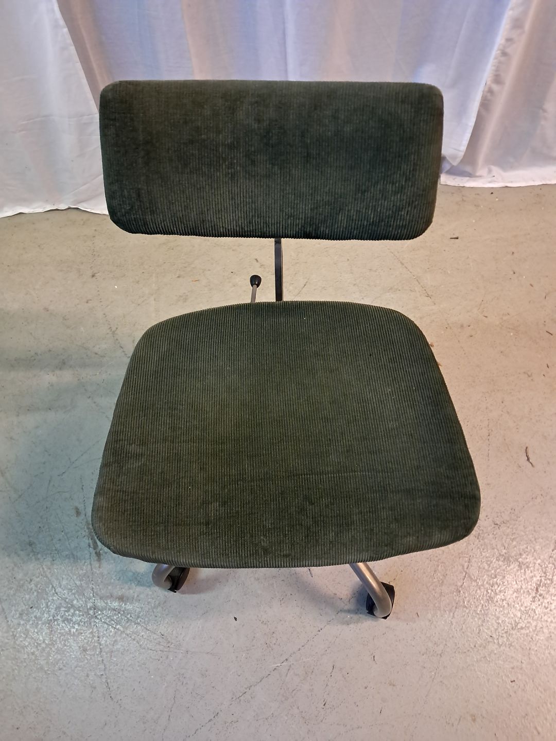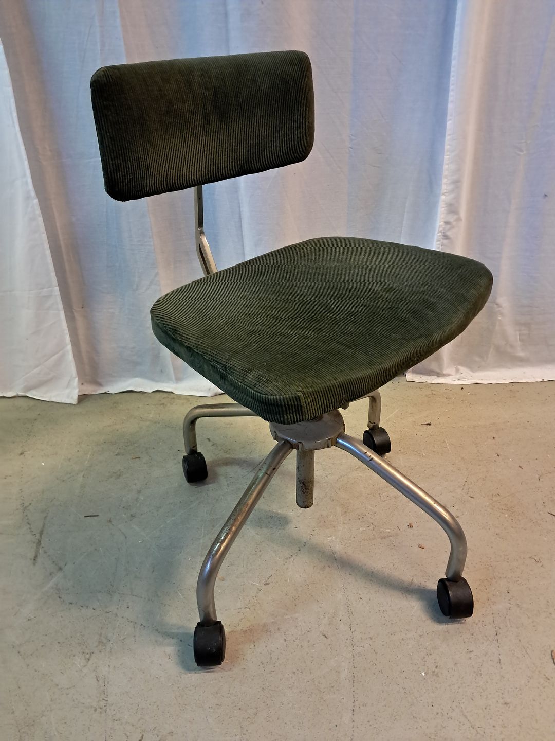 Kontorstol i metal med velourbetræk, fra 1960erne. Den har brugsspor. Ryghøjde 78cm Sædehøjde 47cm Emne nummer: 77470