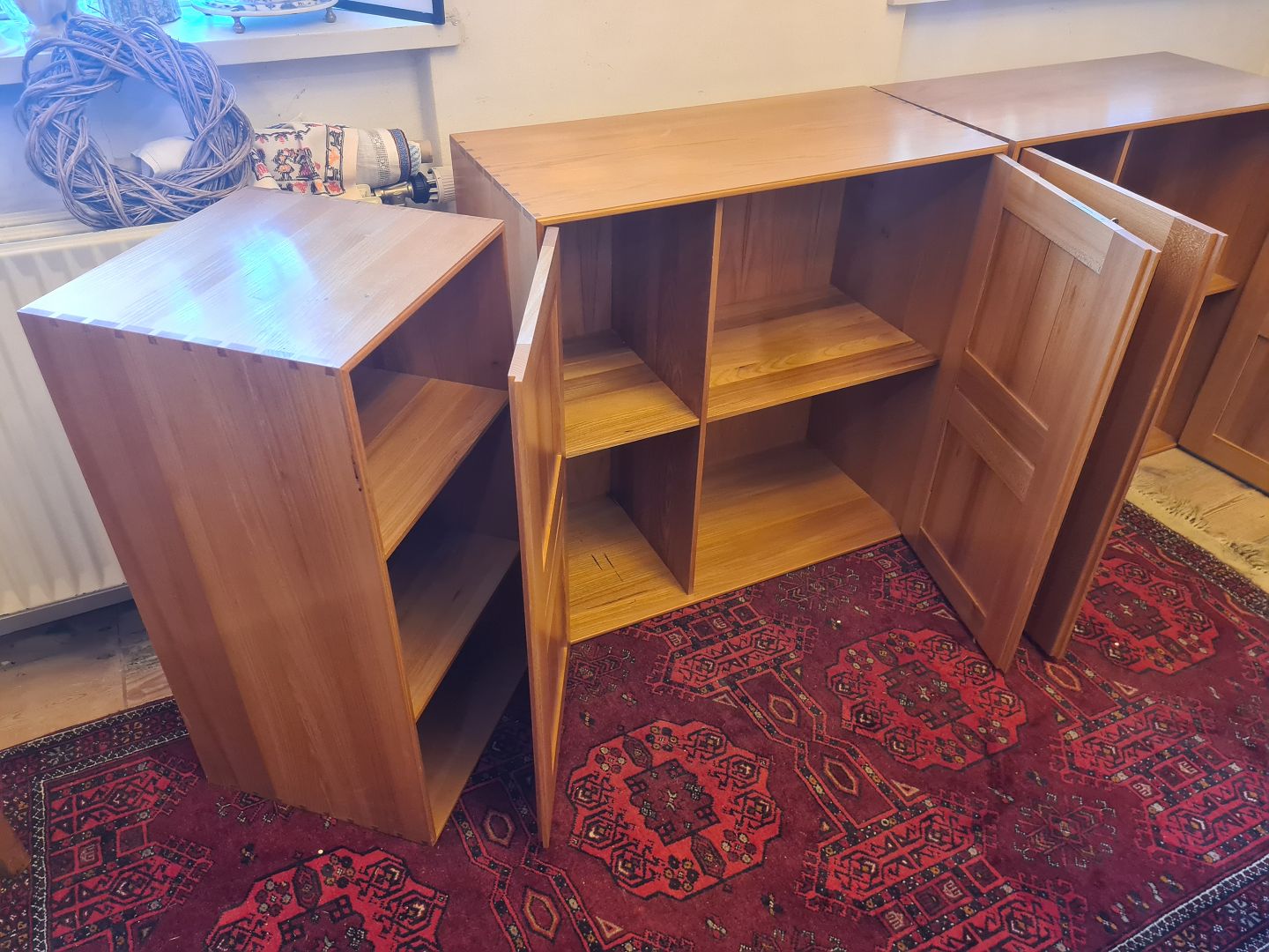 Mogens Koch skabe samt en halv reol udført i massiv Elm for Rud. Rasmussen. Fremstillet Ca. 1970’erne.