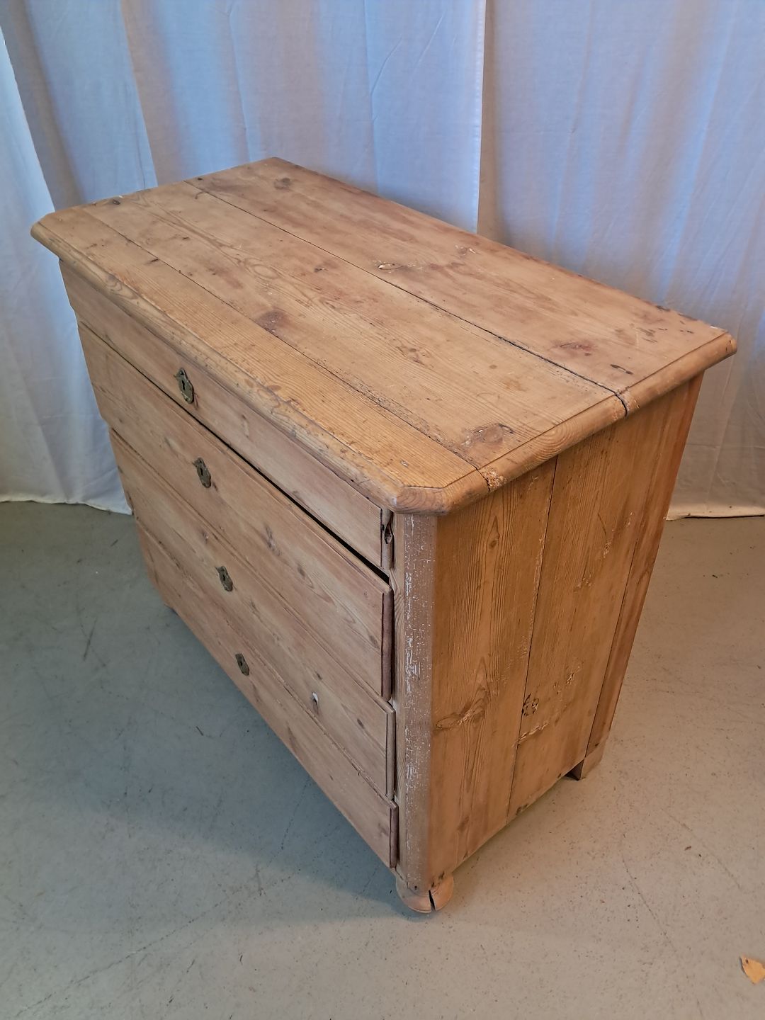 Kommode i massivt fyrretræ, fra 1910erne. Den har brugsspor og skufferne køre, men driller. Højde 91cm Bredde 99cm Dybde 50cm Emne nummer: 77505