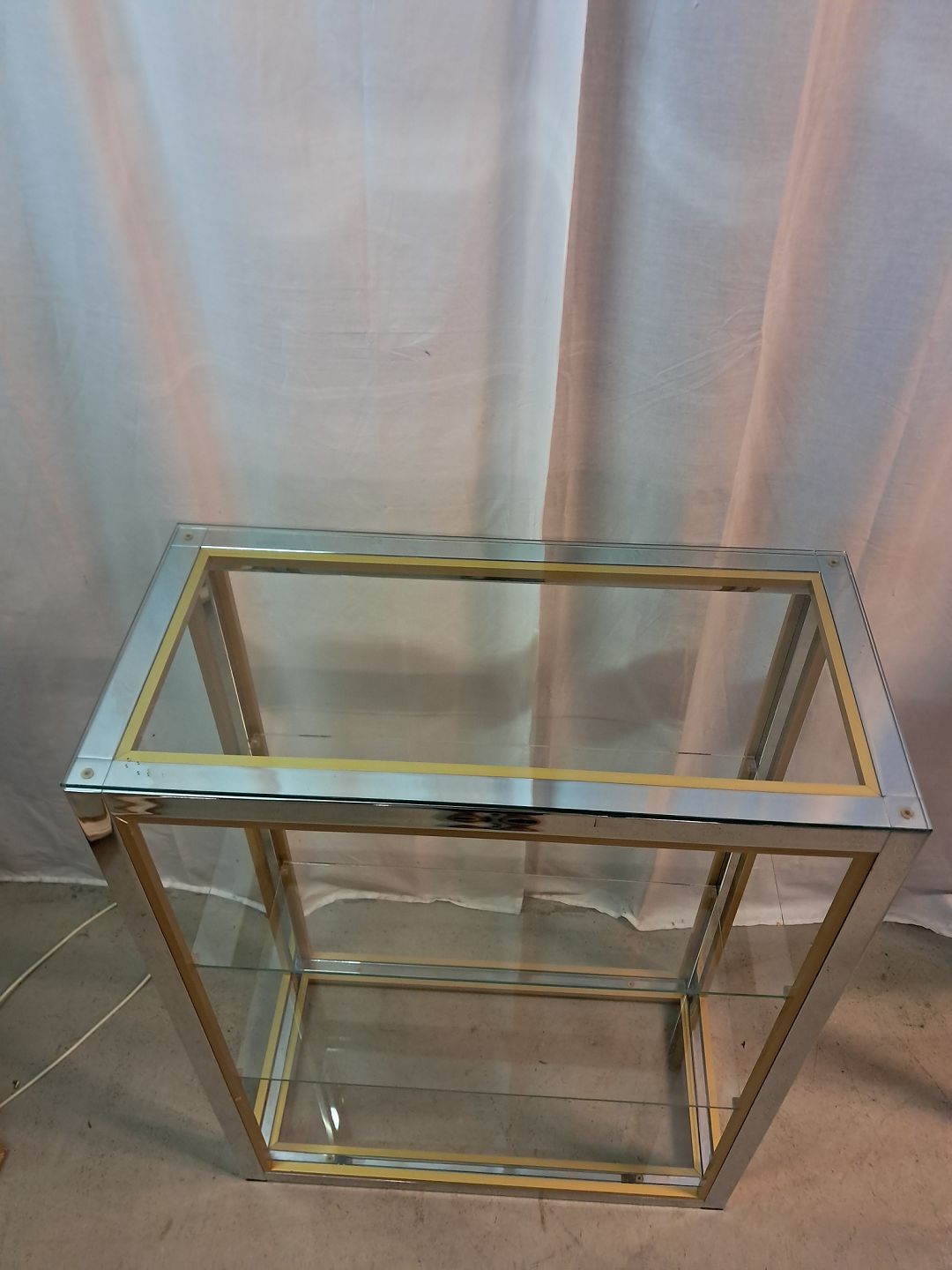 Forkromet reol i metal med glashylder, fra 1980erne. Den har brugsspor. Højde 105cm Bredde 76cm Dybde 37cm Se emne nr. 77573 og 77574 Emne nummer: 77572