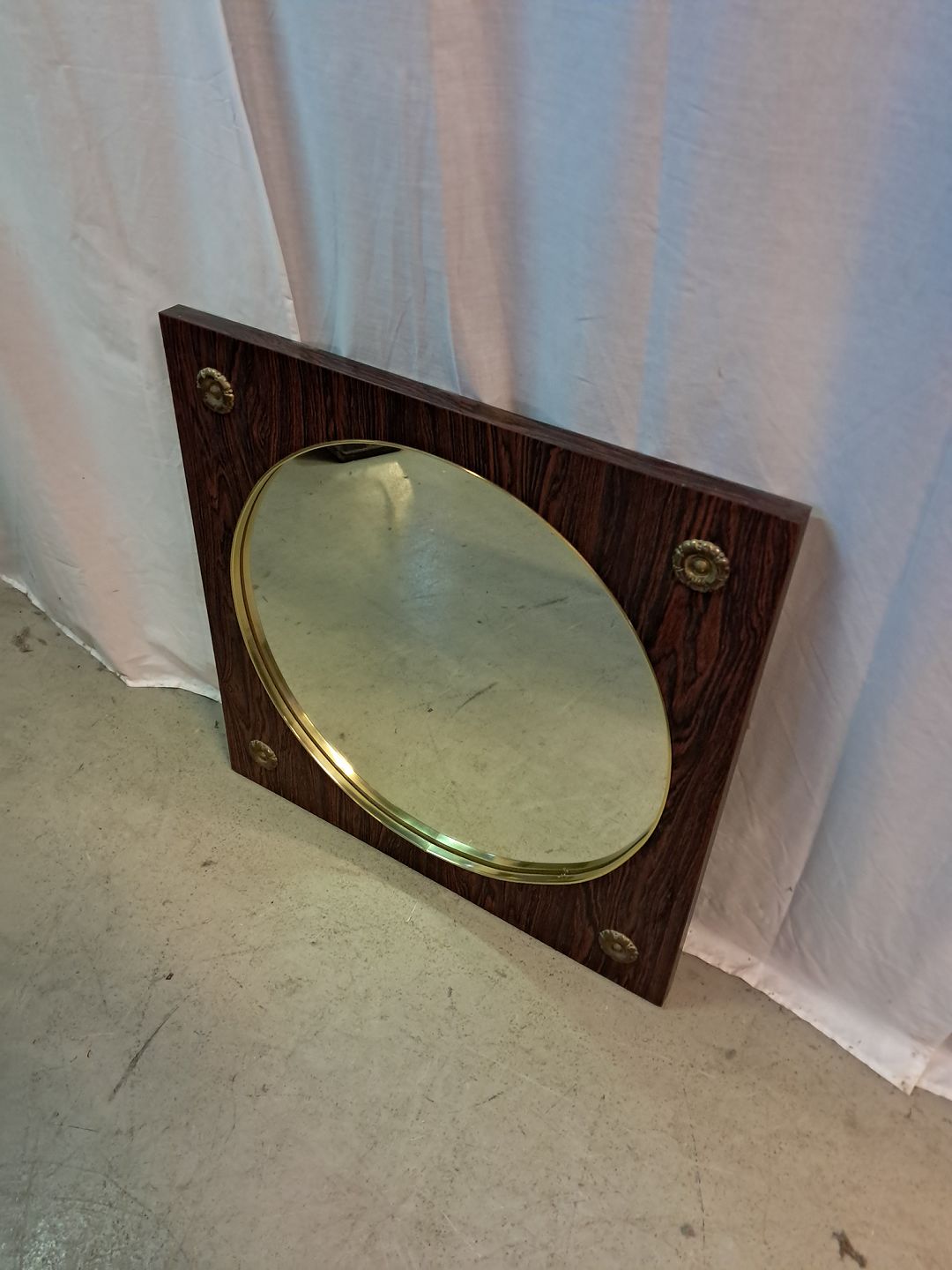 Spejl i fineret palisander, fra 1960erne. Det har brugsspor. Højde 75cm Bredde 75cm Emne nummer: 77593