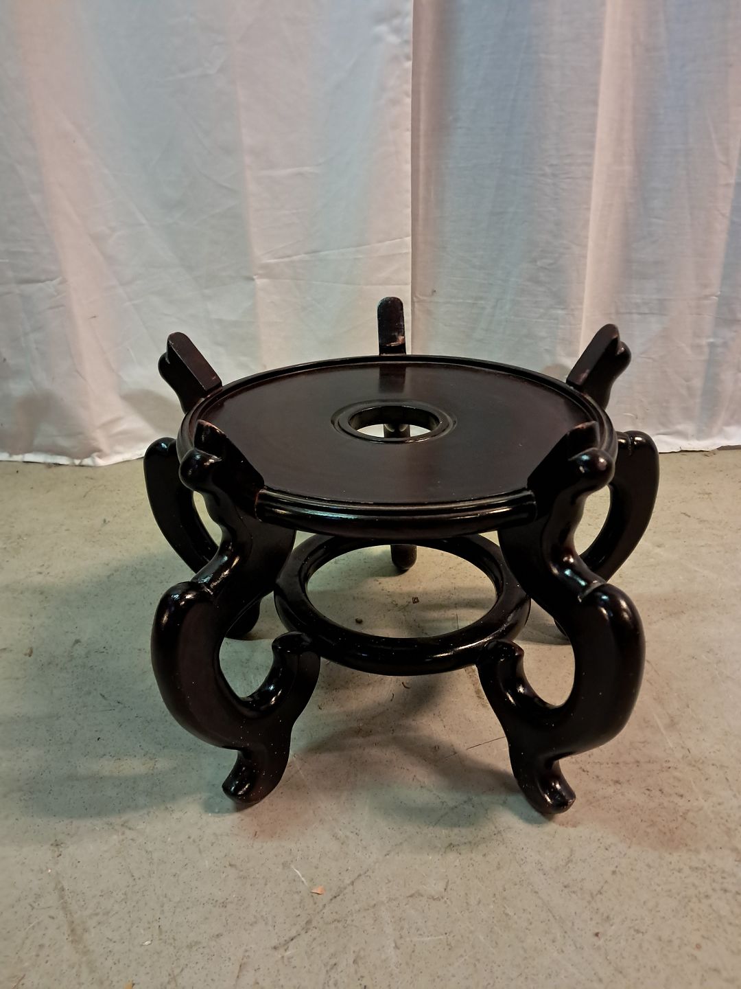 Asiatisk opsats i massivt træ, fra 1990erne. Den har brugsspor. Højde 30cm Diameter 46cm Pladediameter 29,5cm Emne nummer: 77594