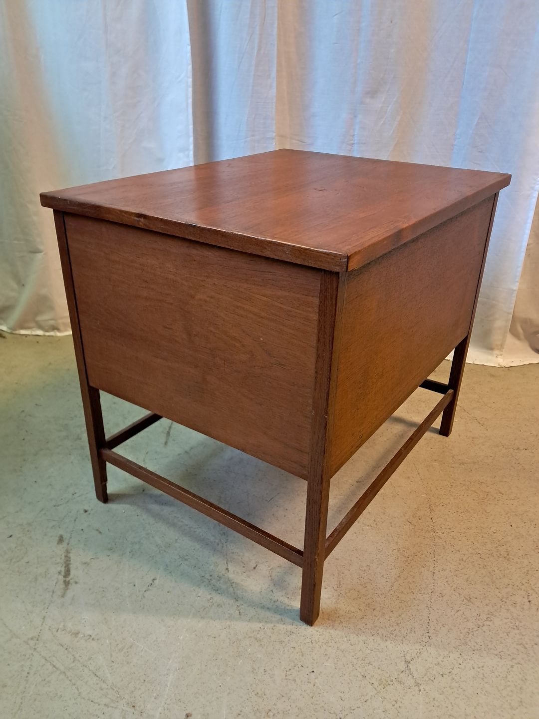 Kassemøbel i fineret teaktræ, fra 1960erne. Det har brugsspor og en defekt på det ene ben. Højde 57cm Bredde 51cm Længde 64cm Emne nummer: 77616