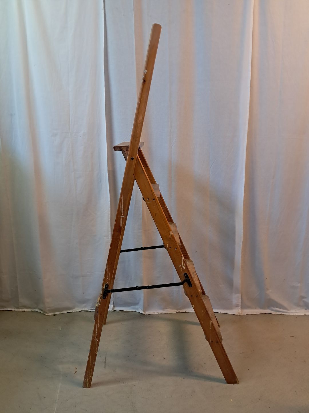 Stige i massivt fyrretræ, fra 1940erne. Den har brugsspor. Højde 168cm Højde på øverste trin 119cm Emne nummer: 77653