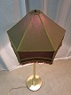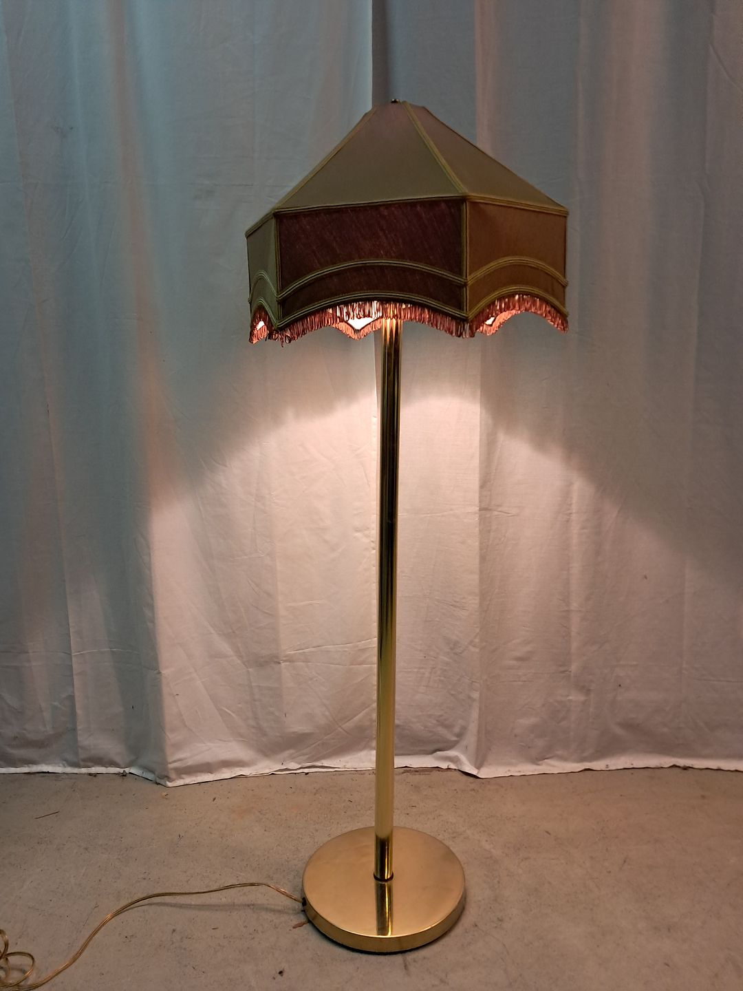 Gulvlampe i metal med lampeskærm, fra 1990erne. Den har brugsspor. Højde 127cm Diameter på fod 26cm Diameter på skærm 50cm Emne nummer: 77658