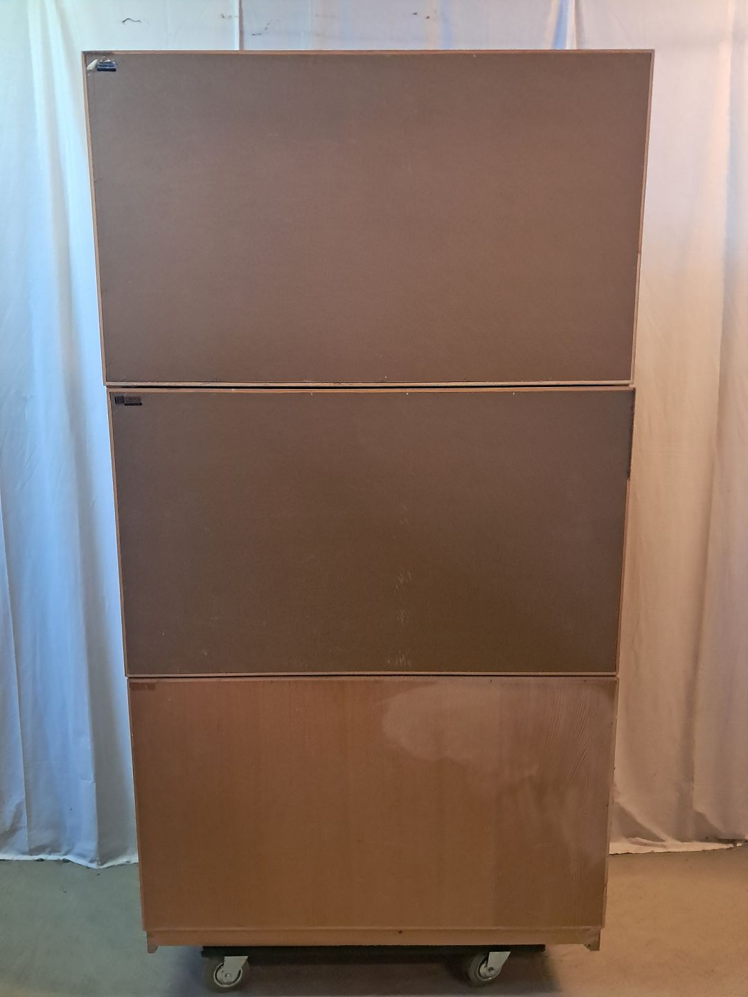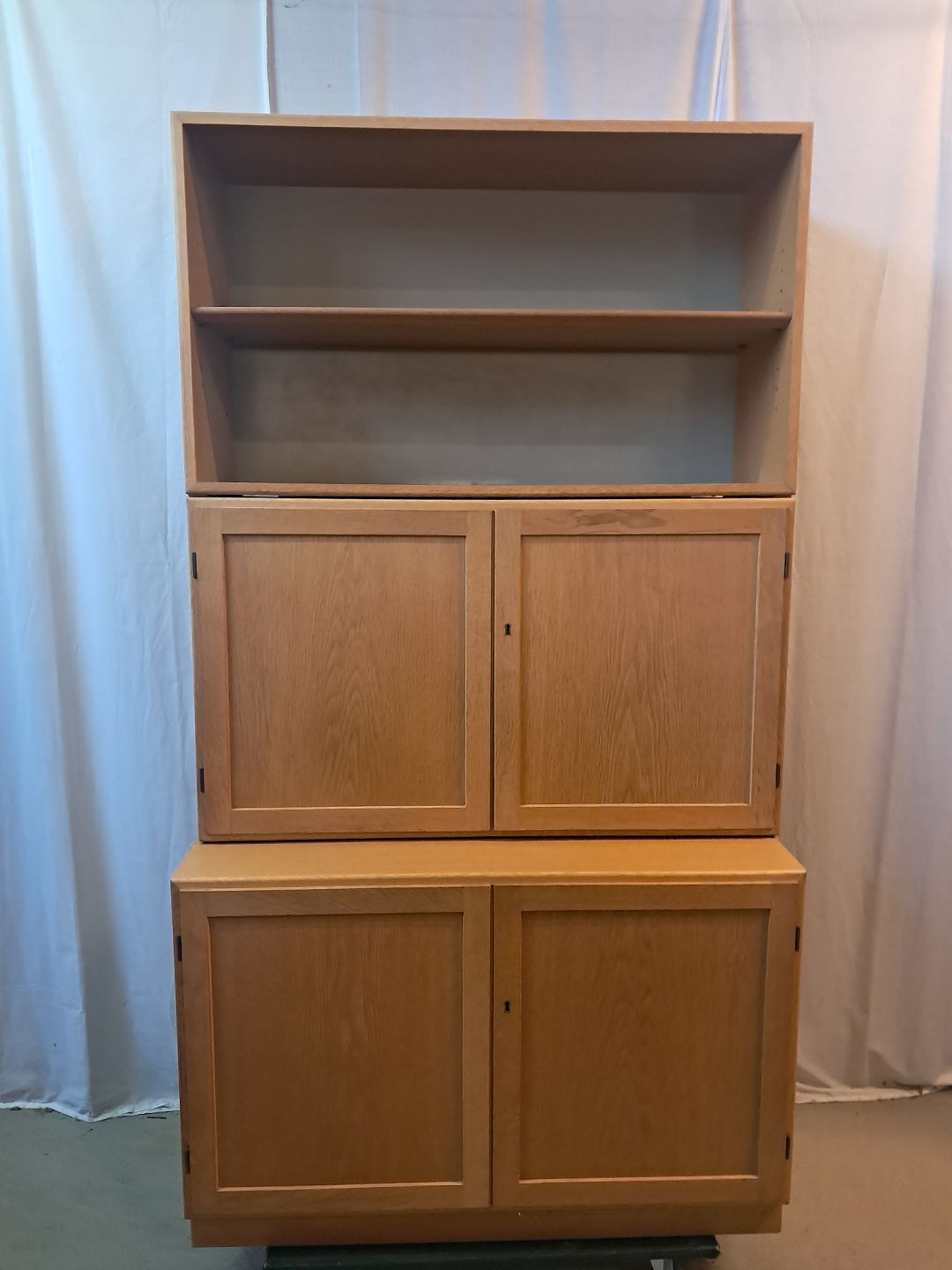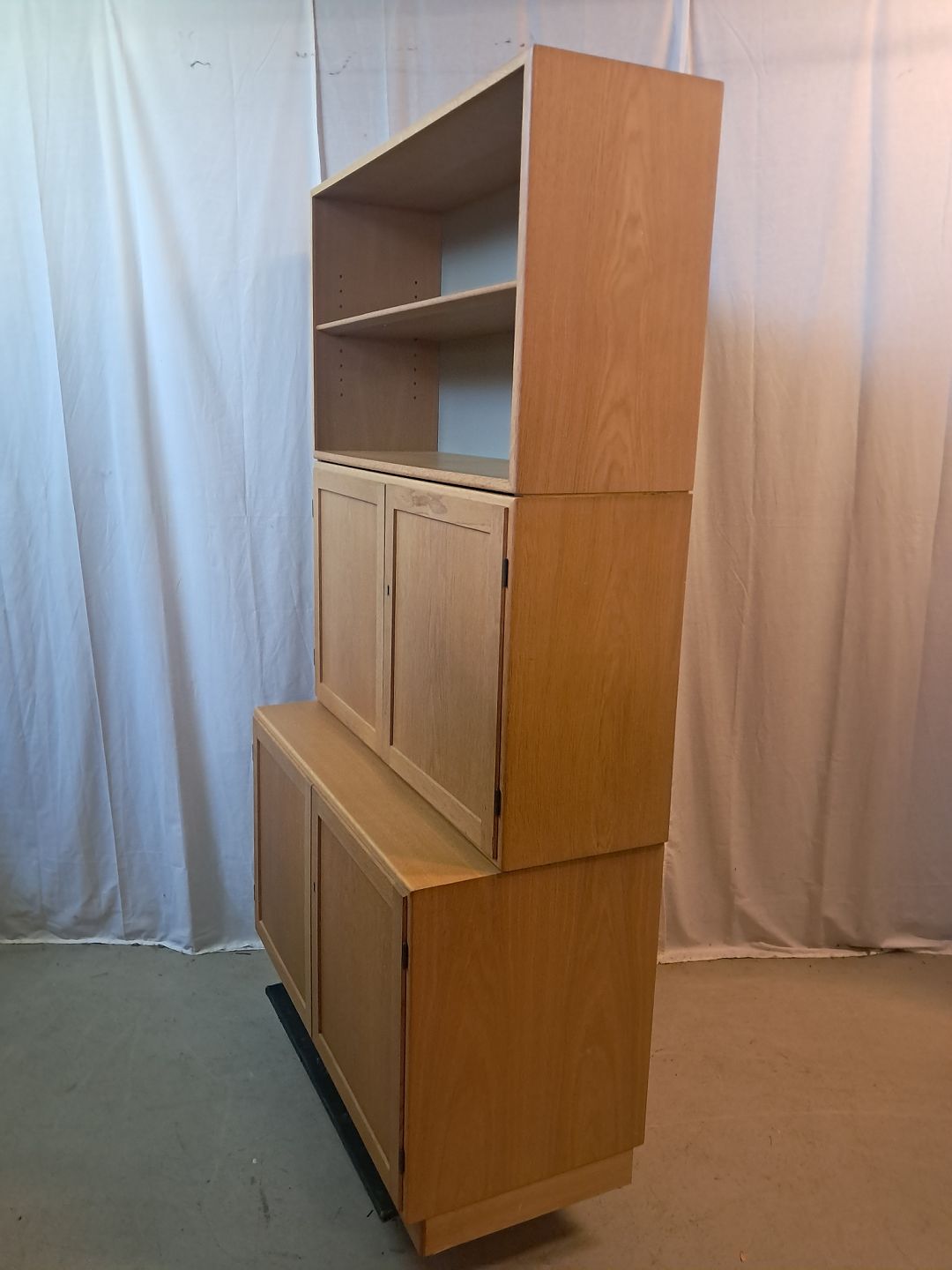 Børge Mogensen reol i fineret egetræ, fra 1970erne. Den består af 3 dele og har brugsspor. Højde 181cm Bredde 100cm Dybder 46cm og 32cm Emne nummer: 77669