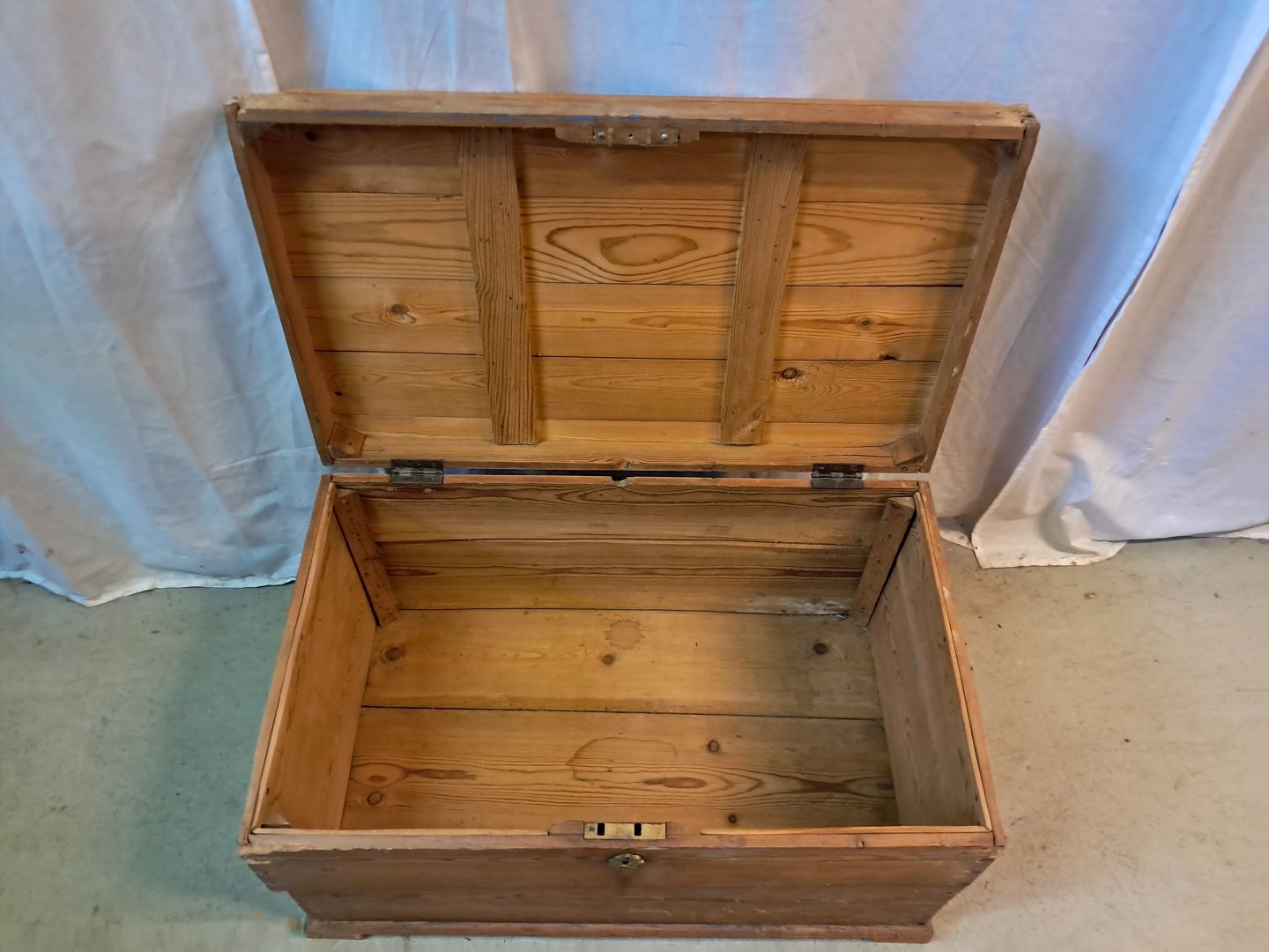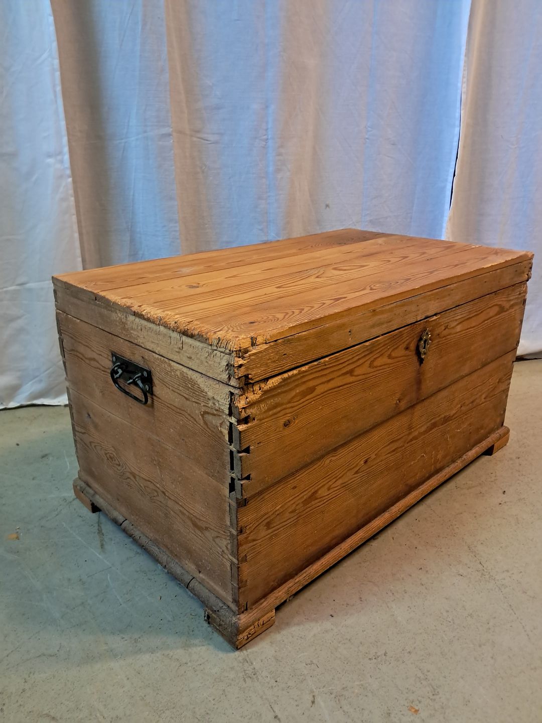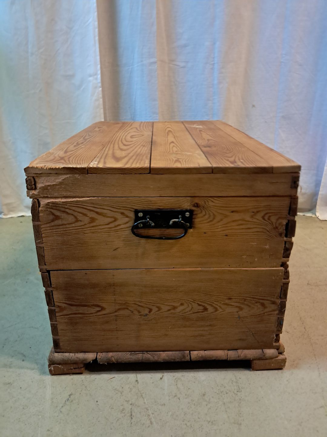 Kiste i massivt fyrretræ, fra 1910erne. Den har brugsspor og skal limes, der med følger ikke nøgle. Højde 39cm Bredde 71cm Dybde 42cm Emne nummer: 77691