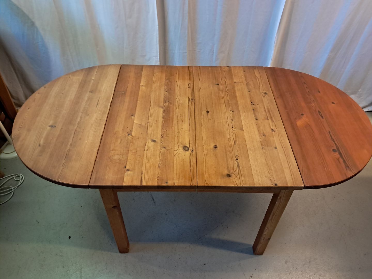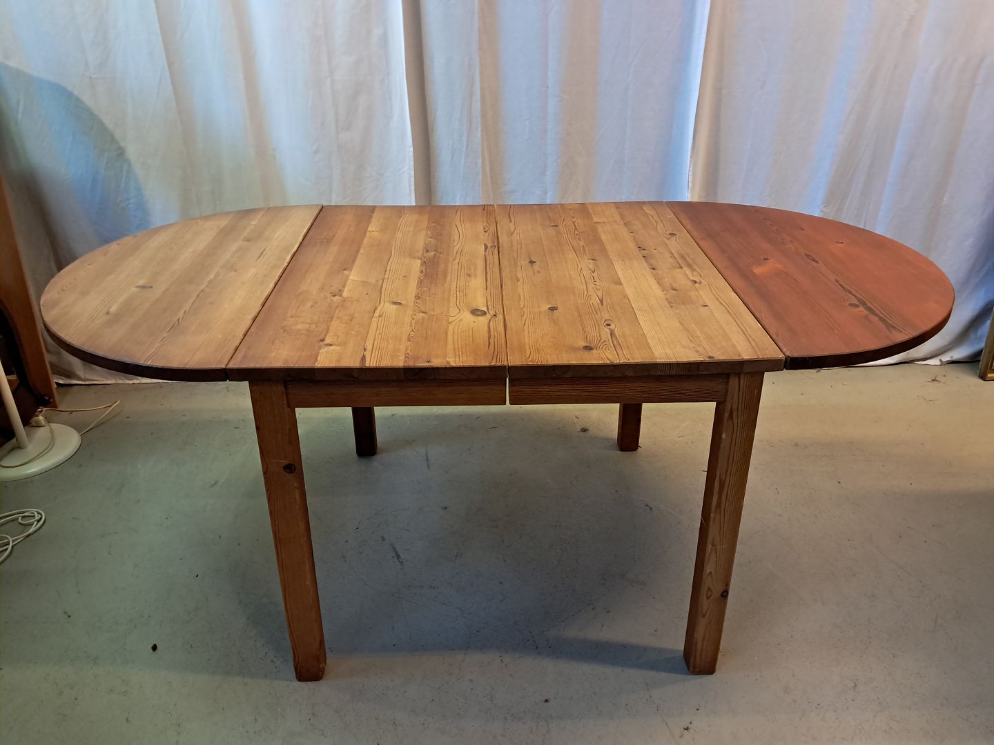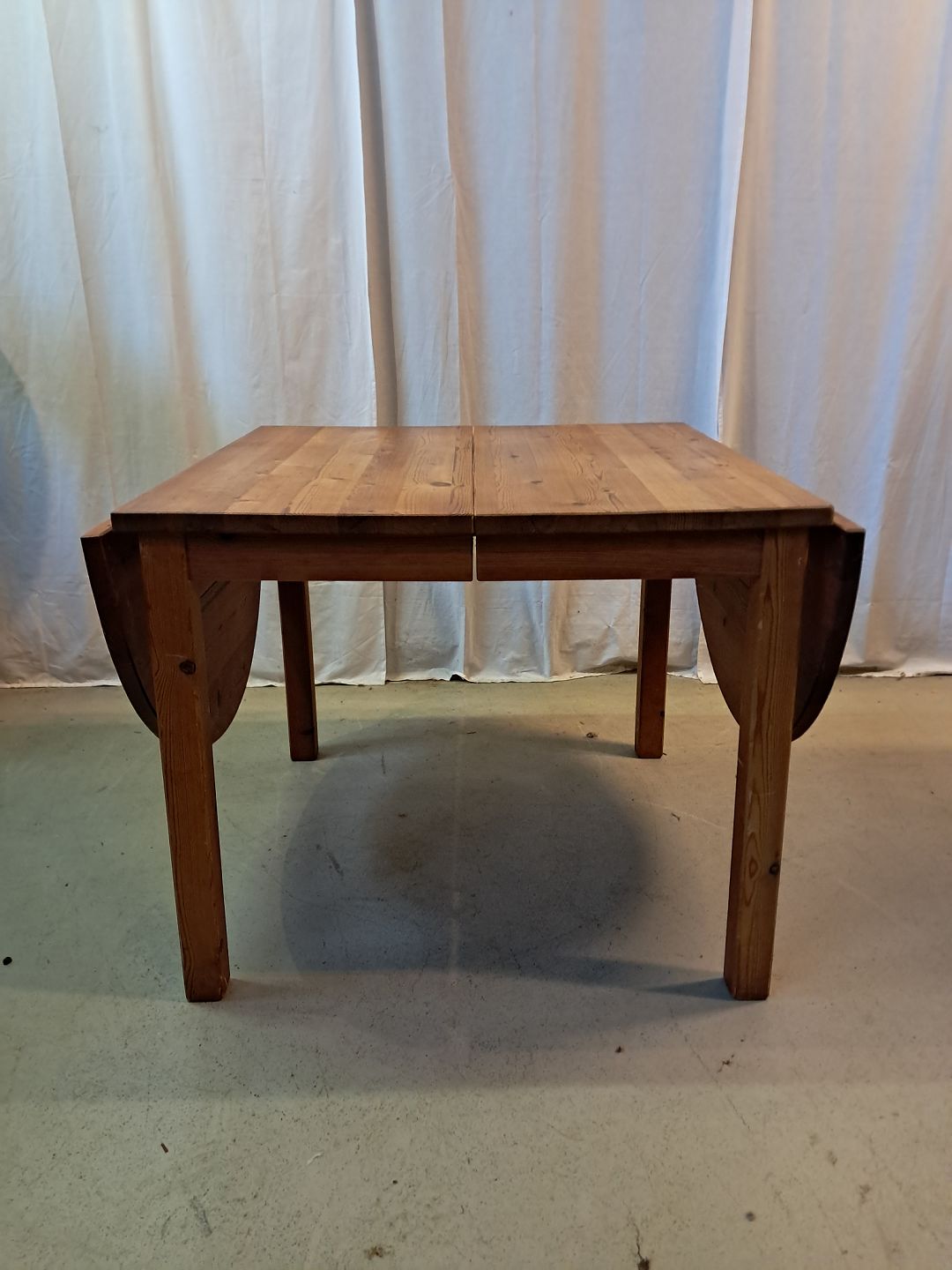 Spisebord i massivt fyrretræ med klapper og 2 tillægsplader, fra 1980erne. Det har brugsspor og trænger til slibning og sæbevand. Højde 72cm Bredde 88cm Længde 87cm Længde med klapper og tillægsplader 268cm Emne nummer: 77699