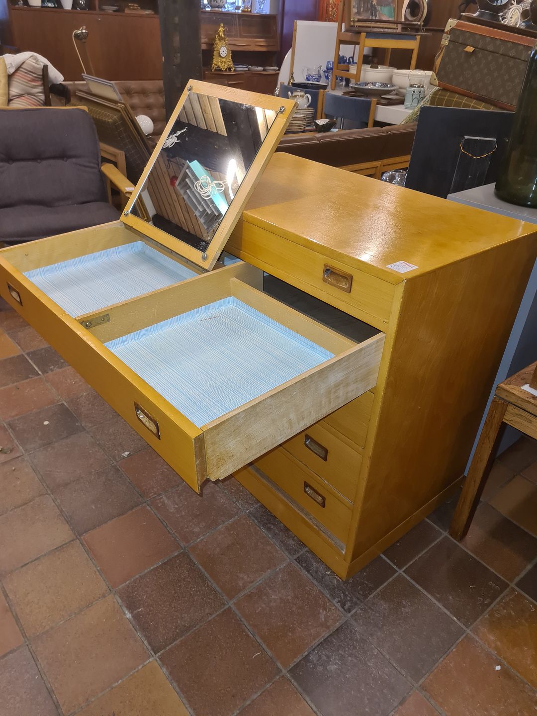 Børge Mogensen kommode m. sminkespejl. udført i lakeret bøg m. greb i teak. Fremstillet for FDB ca. 1940'erne. Fremstår i pæn brugt stand, overflade med brugsspor og skjolder. Mål: H. 84 cm. B. 90,5 cm. D. 52 cm. Emne nummer: 80932