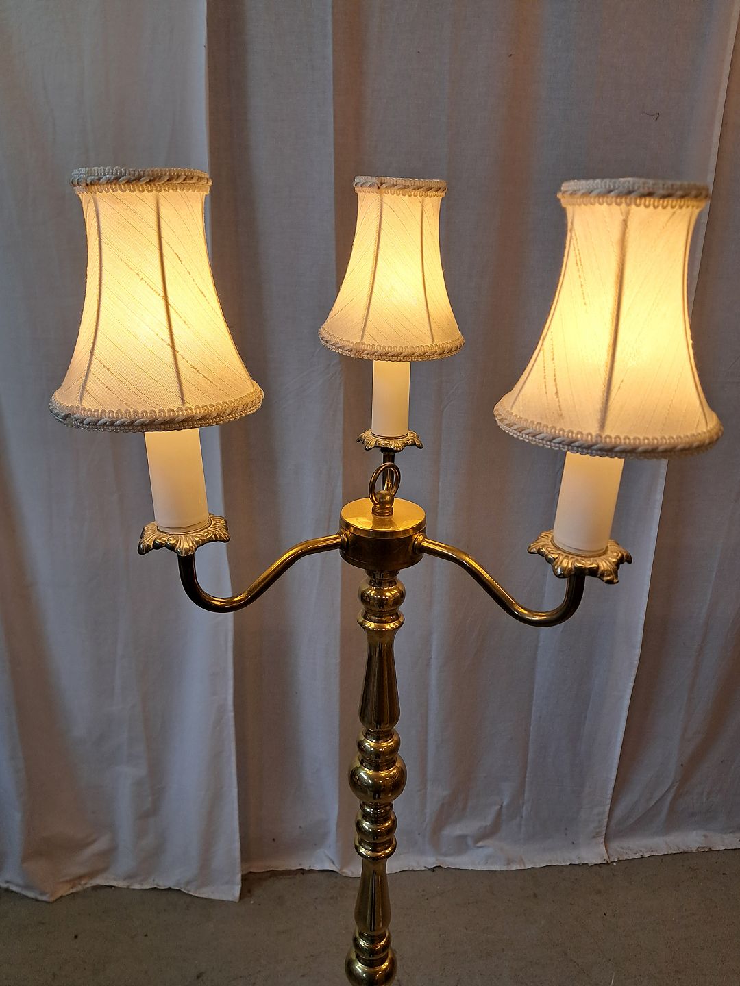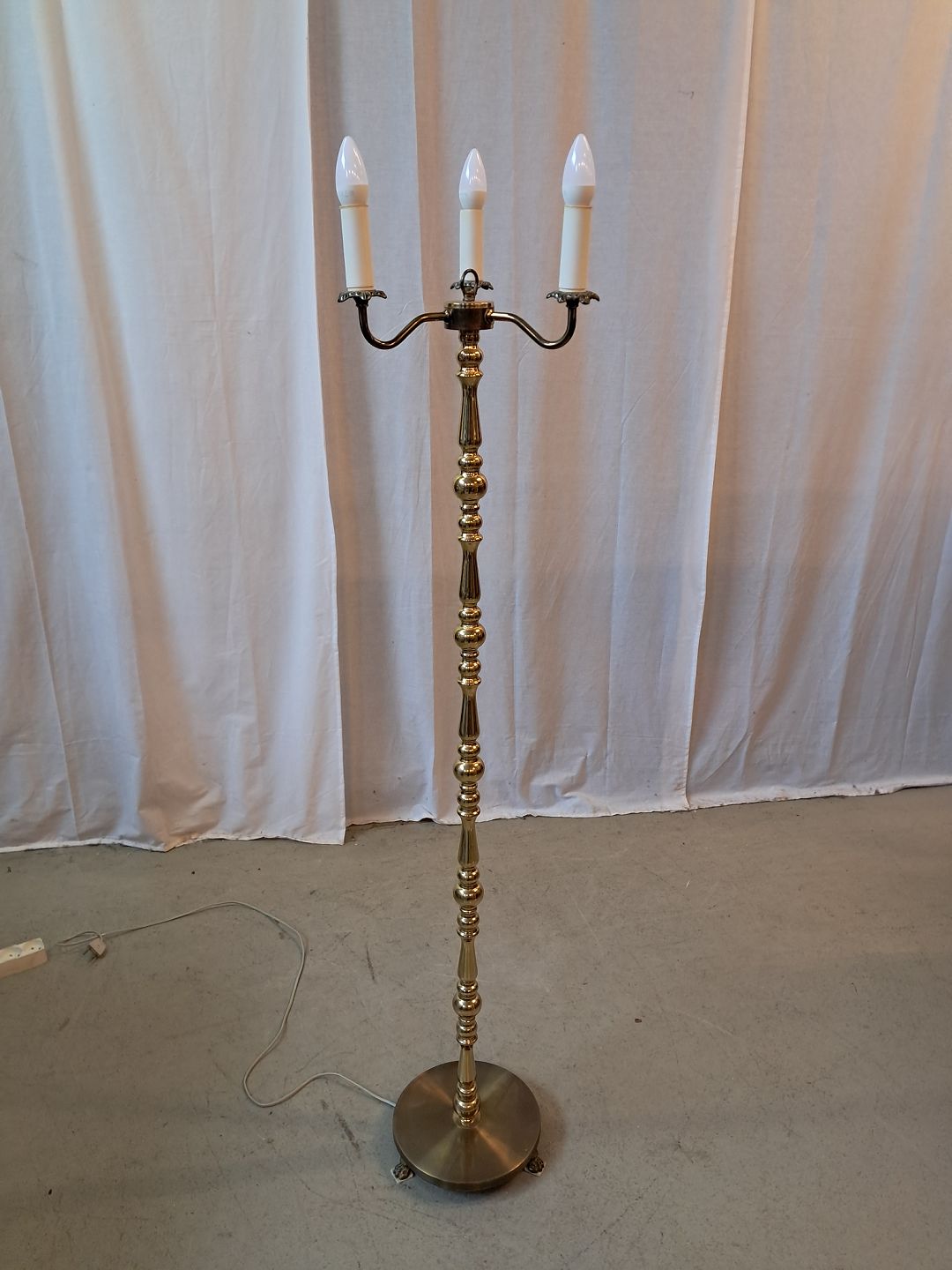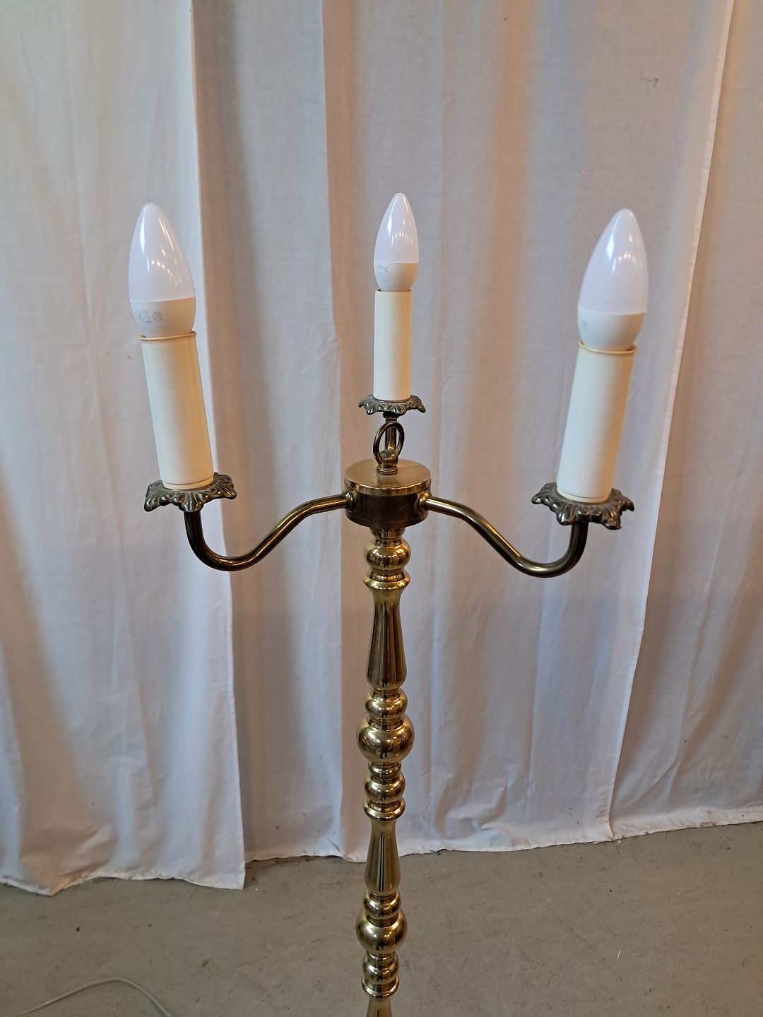 Standerlampe i messing med 3 skærme, fra 1980erne. Den har brugsspor. Højde 150cm Diameter på fod 29cm Emne nummer: 77749