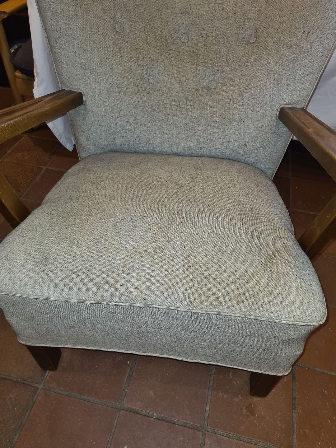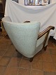 Dansk møbelsnedker overpolstret lænestol i uldstof m. stel af bejdset bøg. Fremstillet ca. 1930'erne. Brugt stand, betræk bør ombetrækkes. Mål: H. 73 cm. B. 68 cm. D. 78 cm. SH. 42 cm. Emne nummer: 81007