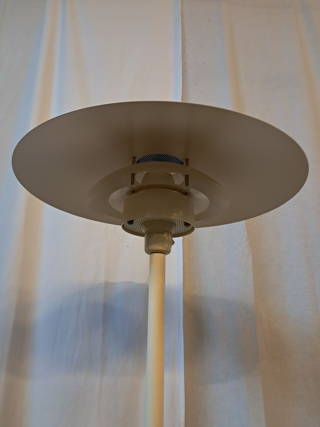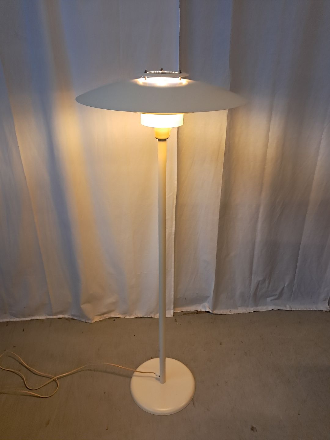 Gulvlampe i malet metal, fra 1990erne. Den har brugsspor. Højde 124cm Diameter på skærm 49cm Emne nummer: 77752
