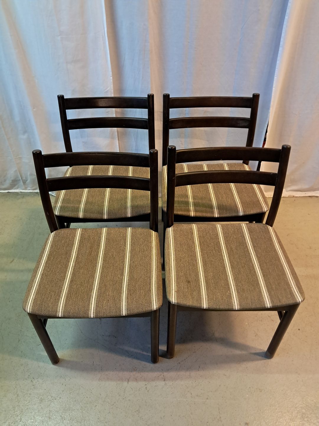 4 Stole i bejdset massivt bøgetræ, fra 1980erne. De har brugsspor. Ryghøjde 79cm Sædehøjde 43cm Emne nummer: 77759