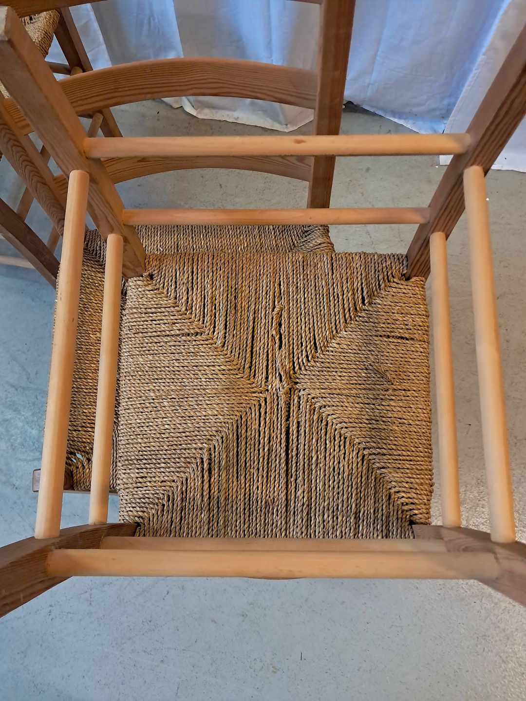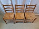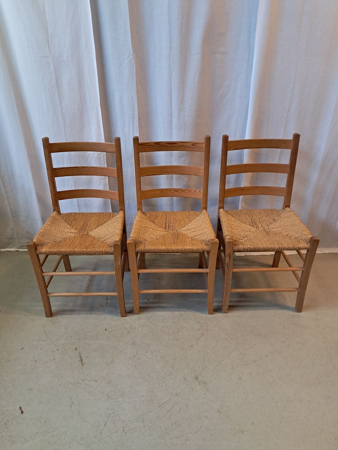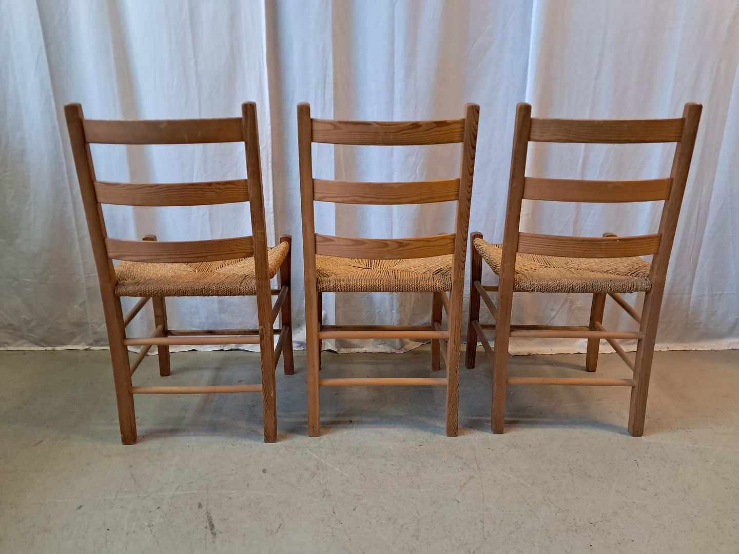 3 Stole i massivt fyrretræ, fra 1980erne. De har brugsspor. Ryghøjde 86cm Sædehøjde 43cm Emne nummer: 77772