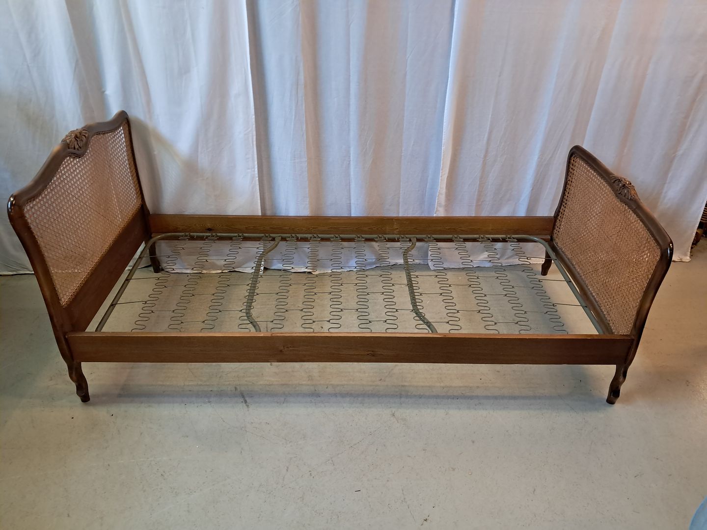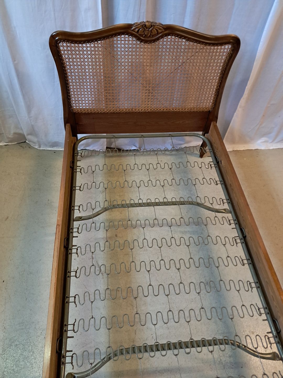 Seng i nødetræ med rørflet, fra 1950erne. Den har brugsspor og der medfølger ikke madras. Gavlhøjder 87cm og 69cm Bredde 93cm Længde 195cm Madras mål : 85cm X 190cm Emne nummer: 77774