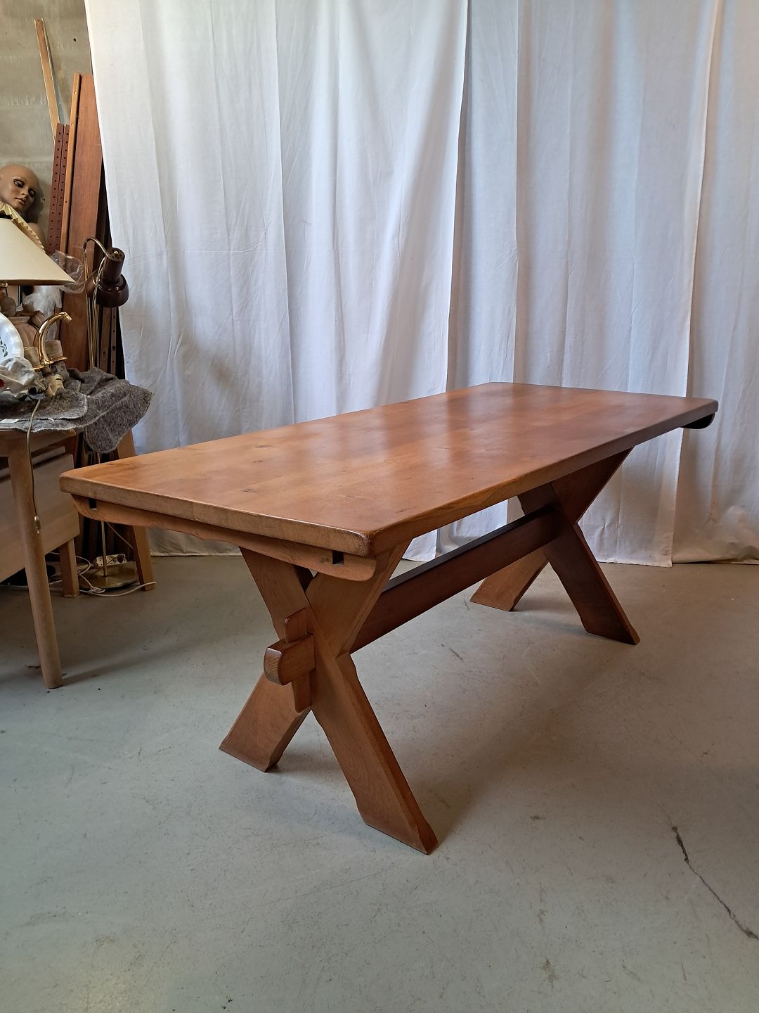 Plankebord i massivt egetræ med 2 tillægsplader, fra 1980erne. Det har brugsspor. Højde 75cm Bredde 81cm Længde 179cm Længde med tillægsplader 276cm Emne nummer: 77789