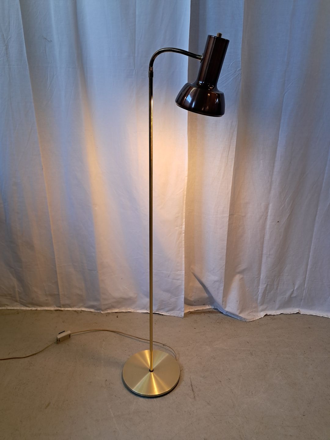 Standerlampe i metal fra 1970erne. Den haer brugsspor. Højde 132cm Diameter på fod 25cm Emne nummer: 77791