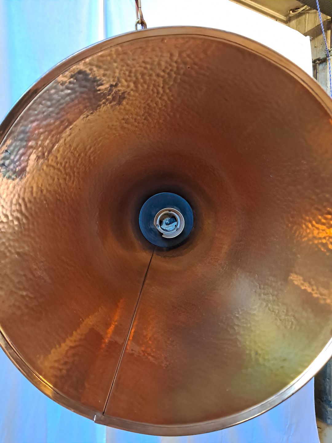 Lampe i metal fra 1980erne. Den har små brugsspor. Højde med kæde 100cm Diameter 32cm Emne nummer: 77795