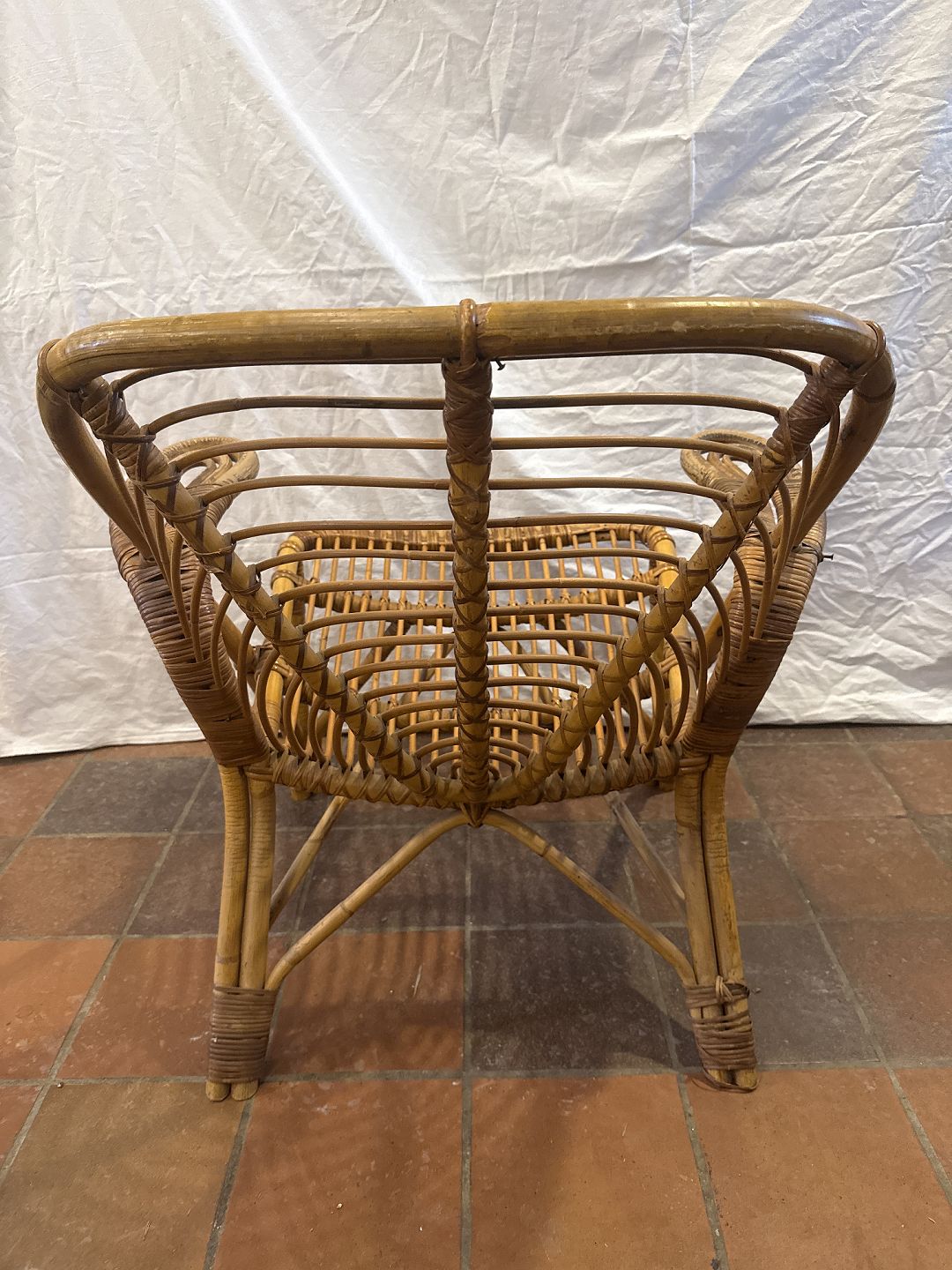Dansk møbelproducent kurvestol i bambus. Fremstillet ca. 1930'erne. Brugt stand, fremstår med brugsspor. Mål: H. 70 cm. B. 68 cm. D. 75 cm. SH. 37 cm Emne nummer: 81063