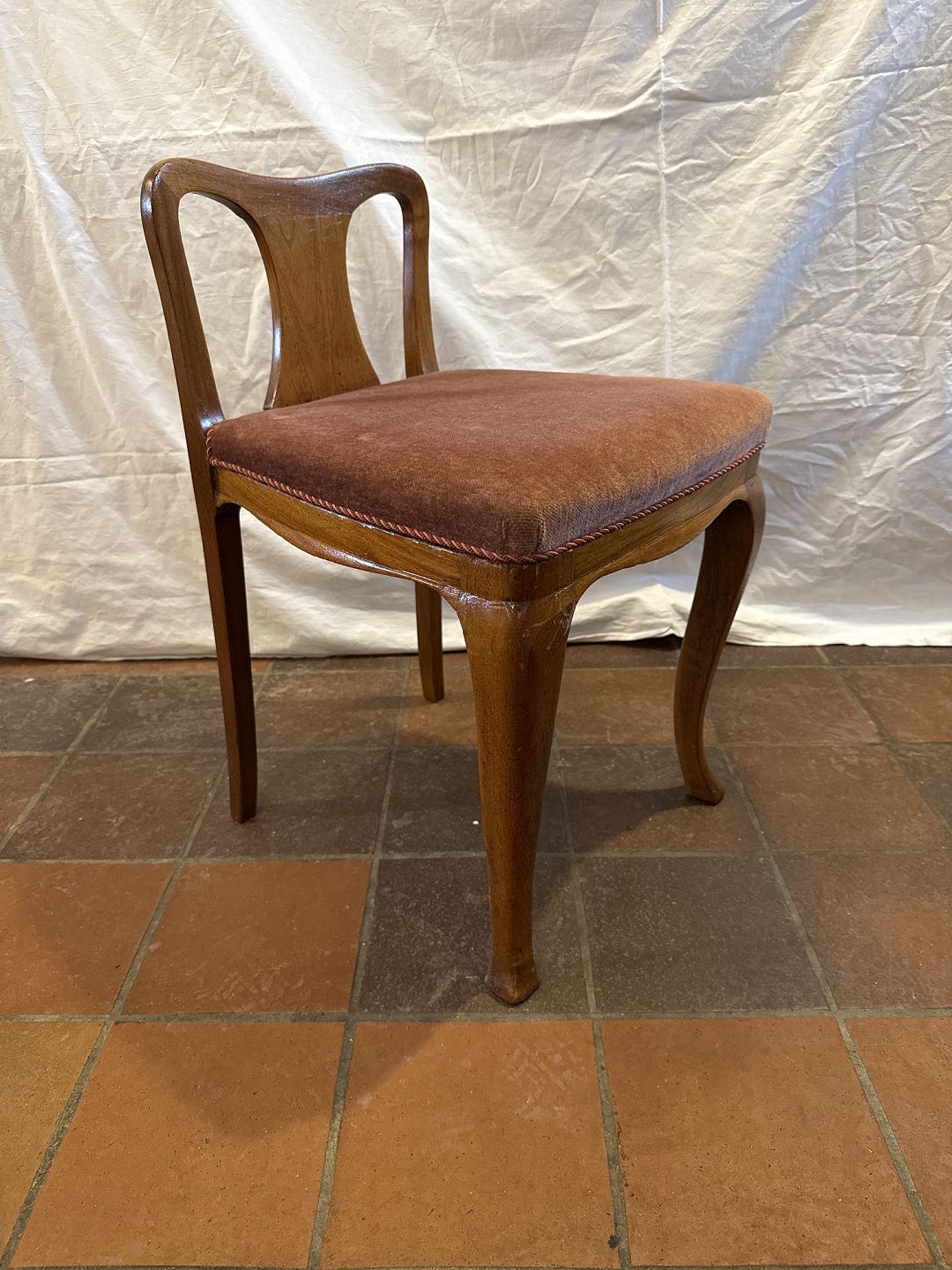 Ukendt formgiver lav rygget stol i lakeret mahogni m. sæde i velourstof. Fremstillet ca. 1920'erne. Pæn brugt stand. Mål: H. 65 cm. B. 41. cm. D. 44 cm. SH. 44 cm. Emne nummer: 81077