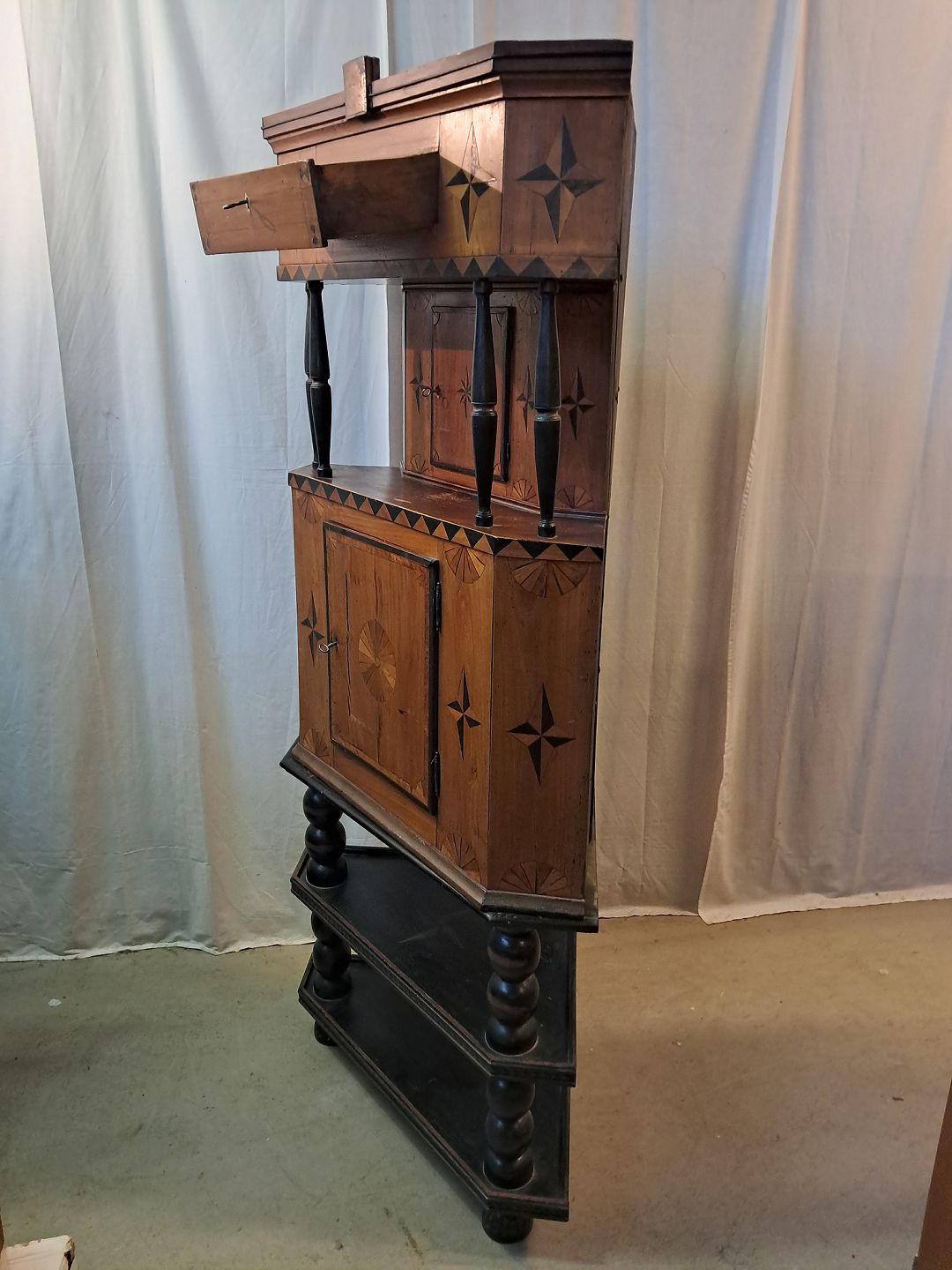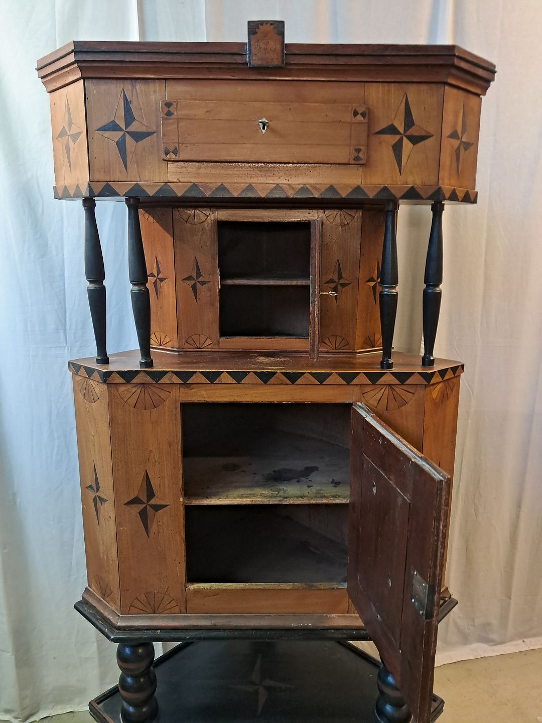 Hjørneskab i ege og elmetræ, det har 200 års jubilæum Det har brugsspor. Højde 188cm Bredde 88cm Dybder 65cm Emne nummer: 77820