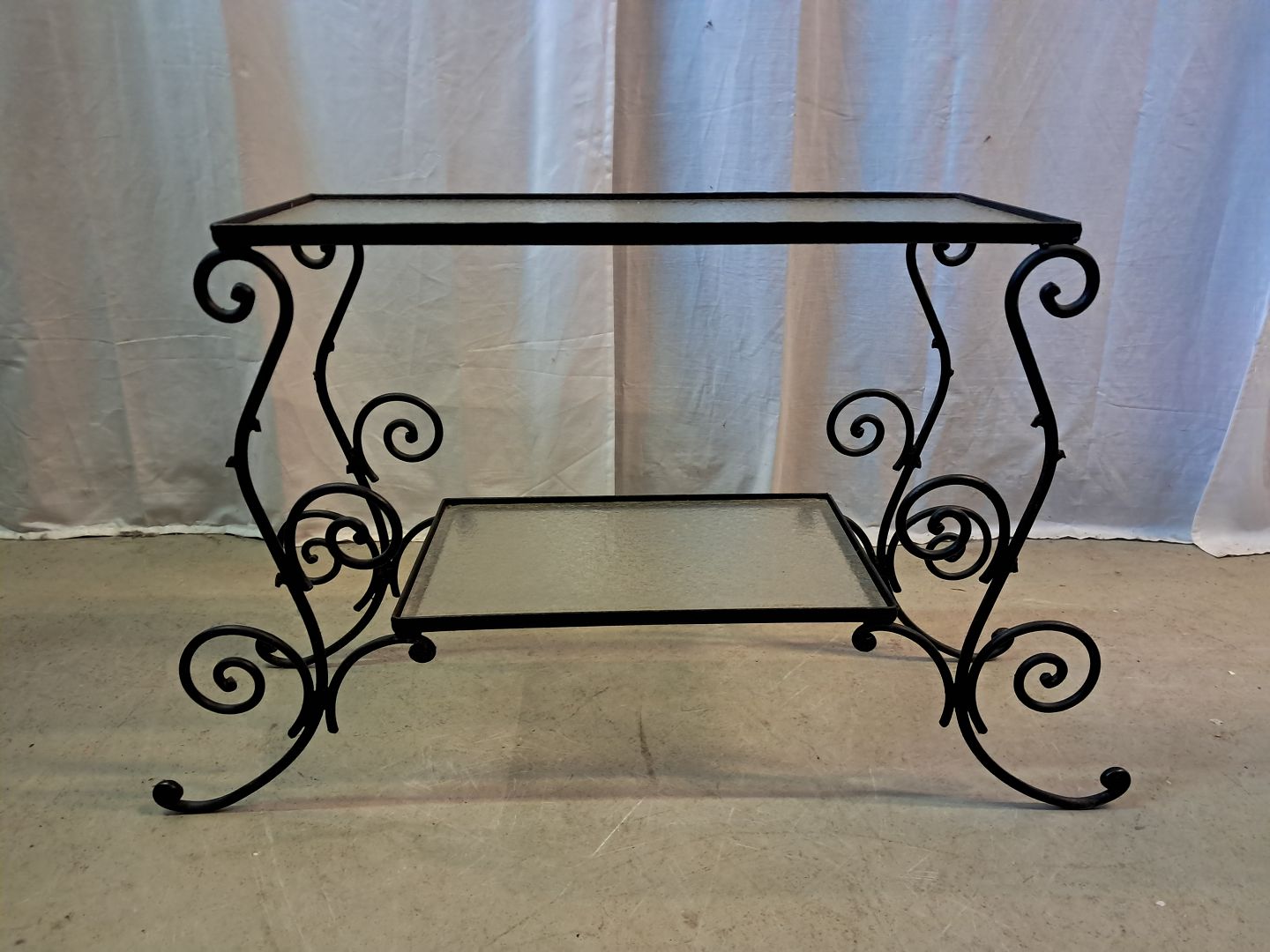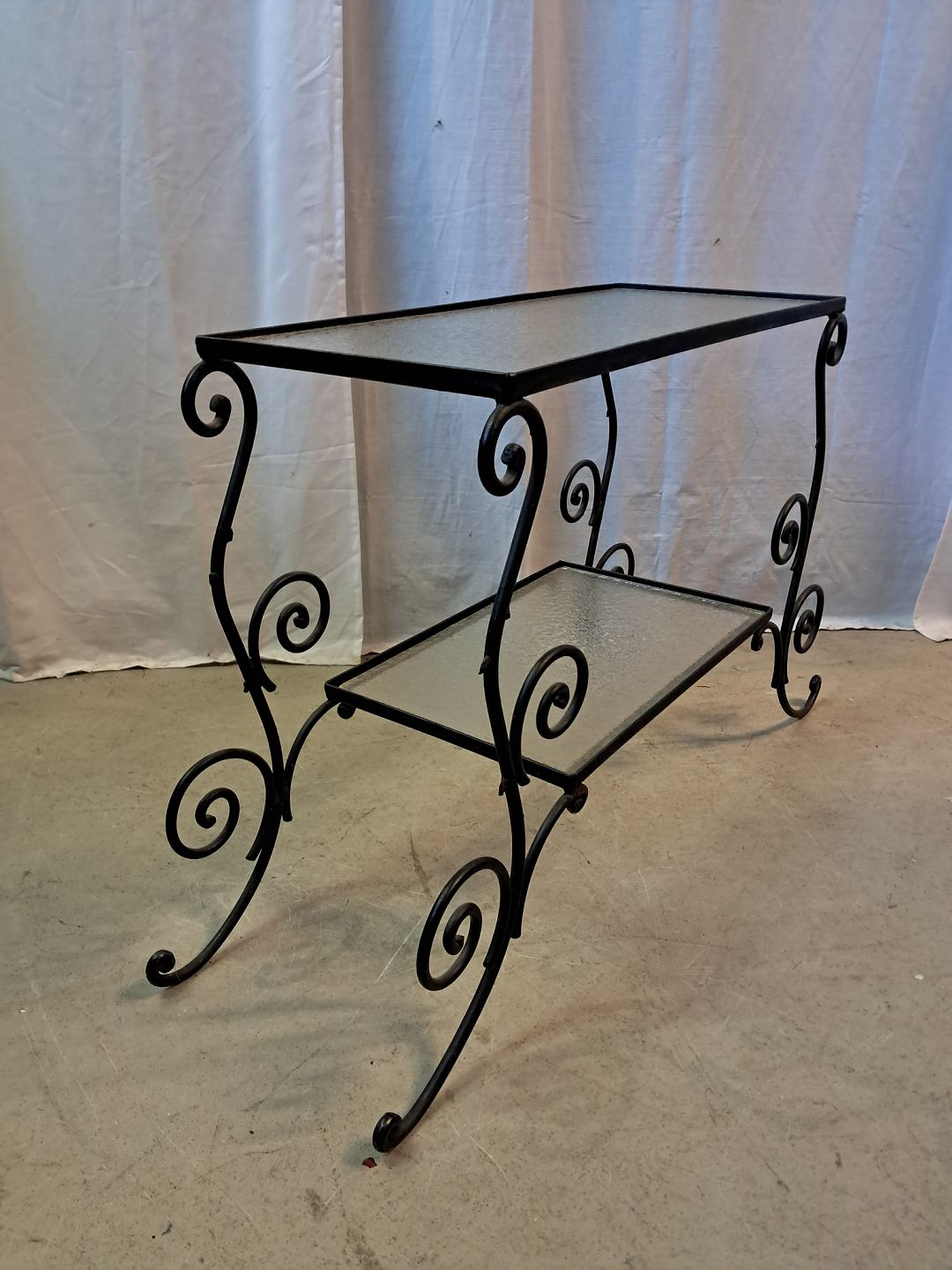 Plantebord i malet metal med glasplader, fra 1940erne. Det har brugsspor. Højde 50cm Bredde 26cm Længde 85cm Emne nummer: 77822