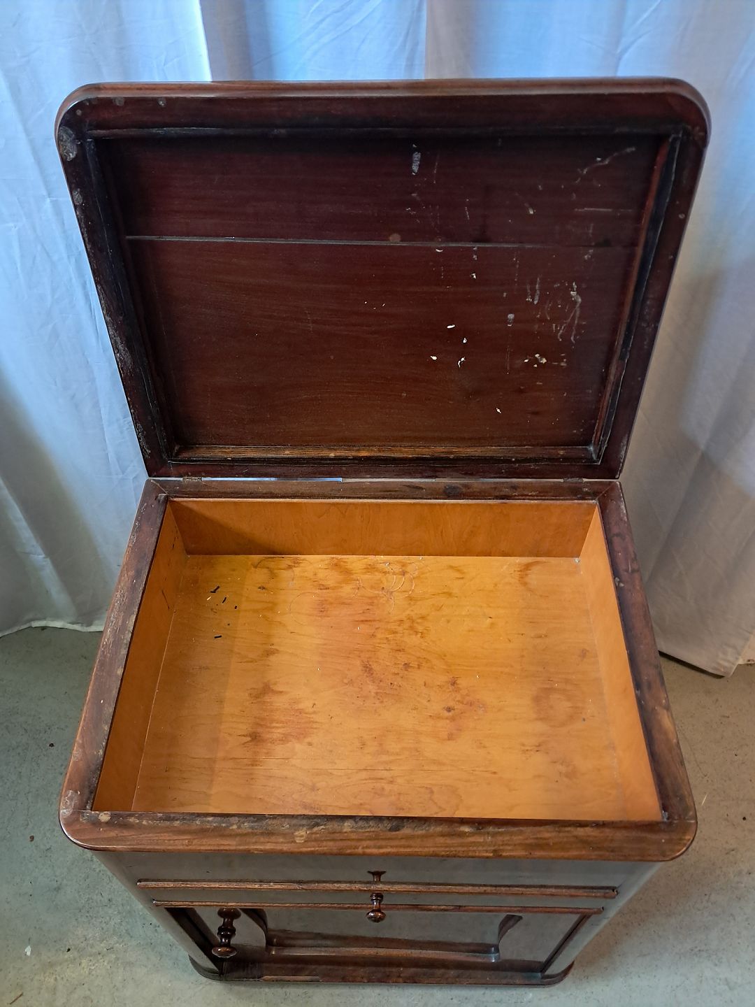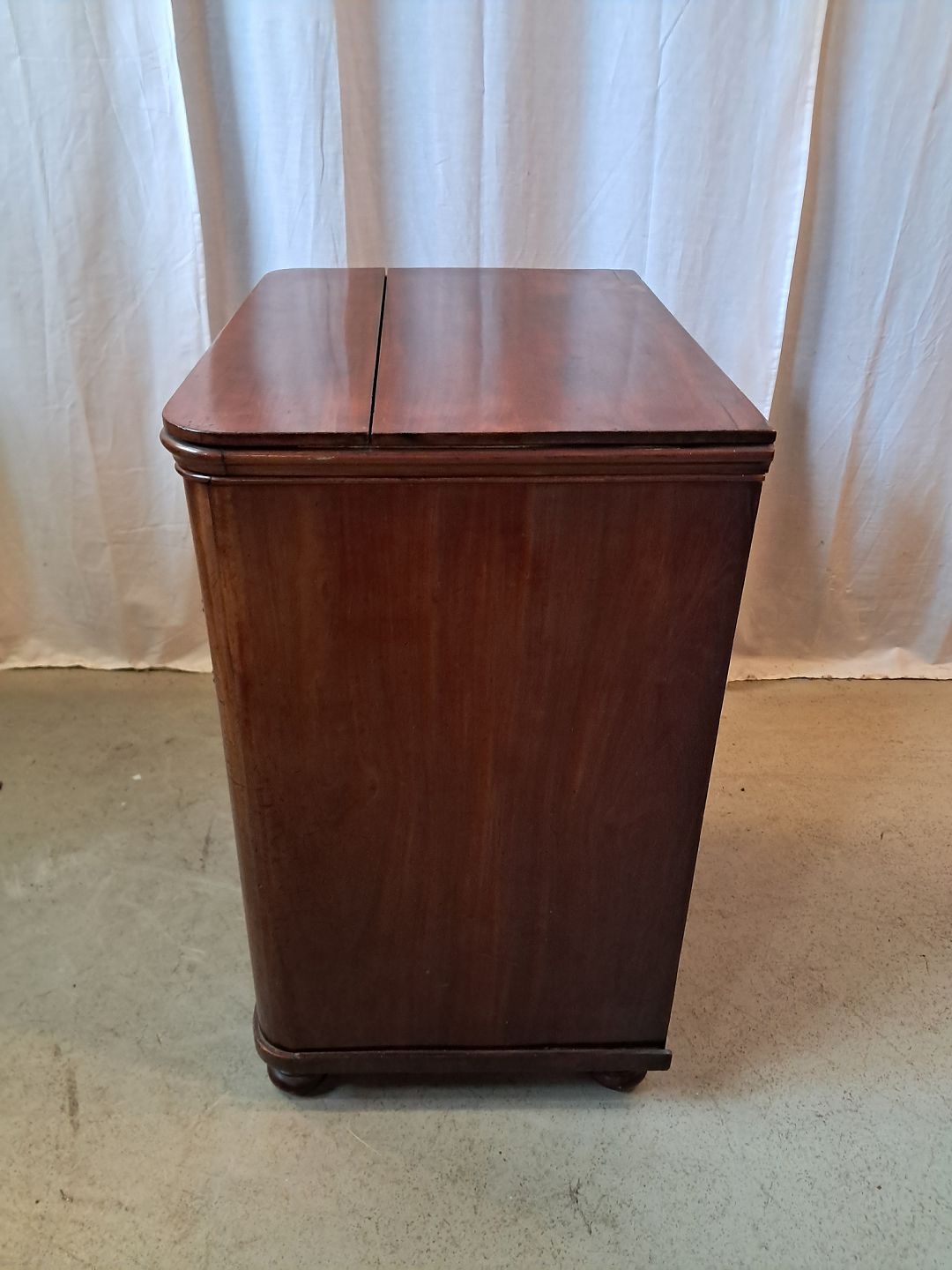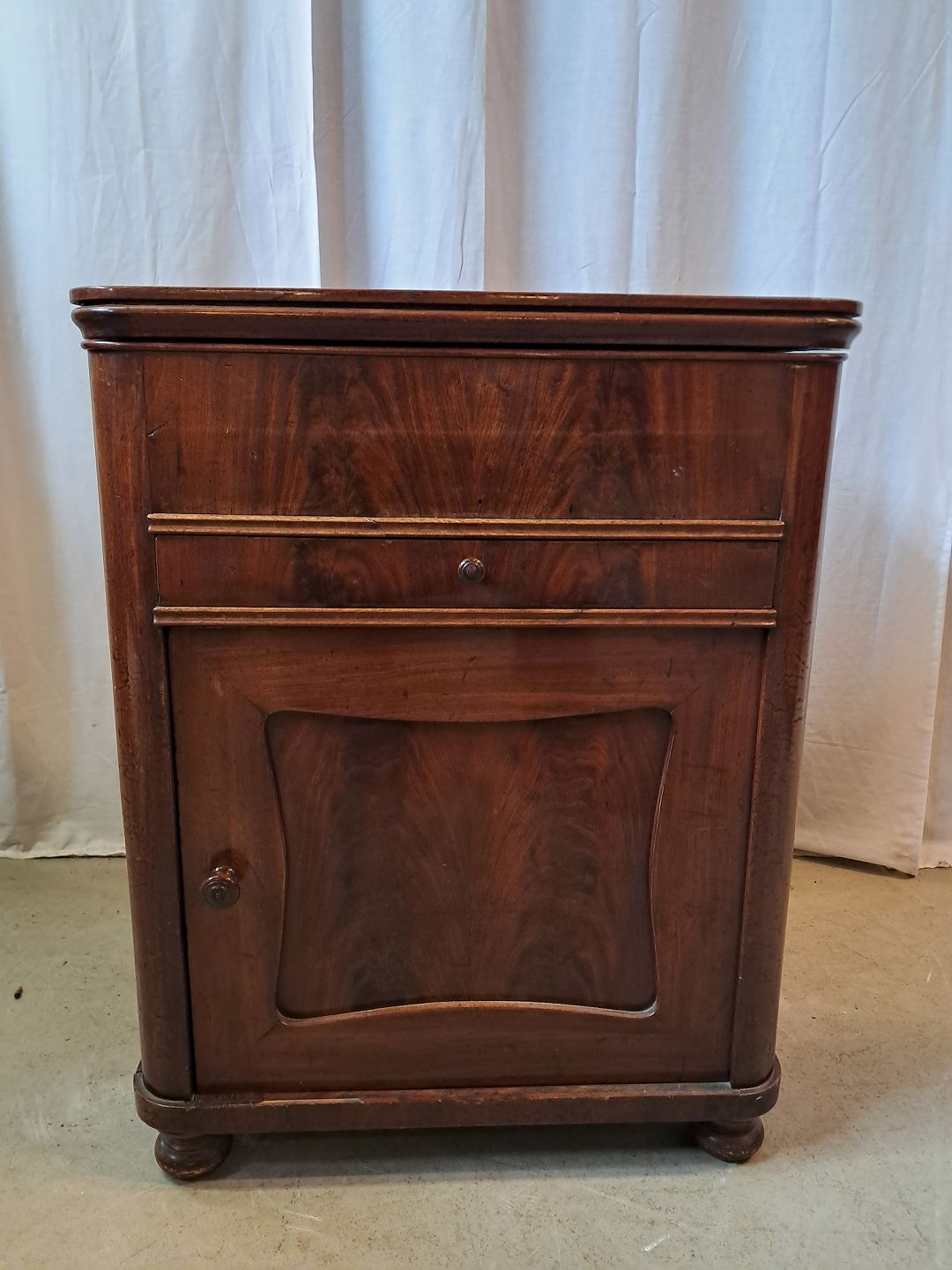 Servante i fineret mahogni, fra 1910erne. Den har brugsspor og en revne i toppladen. Højde 76cm Bredde 60cm Dybde 44cm Emne nummer: 77839
