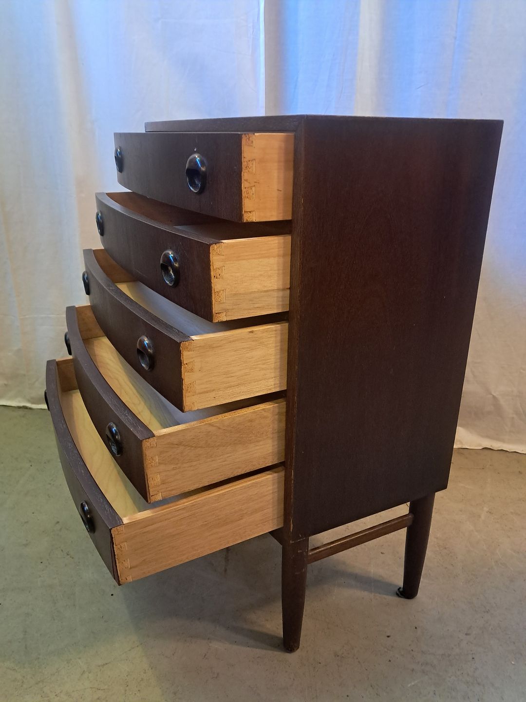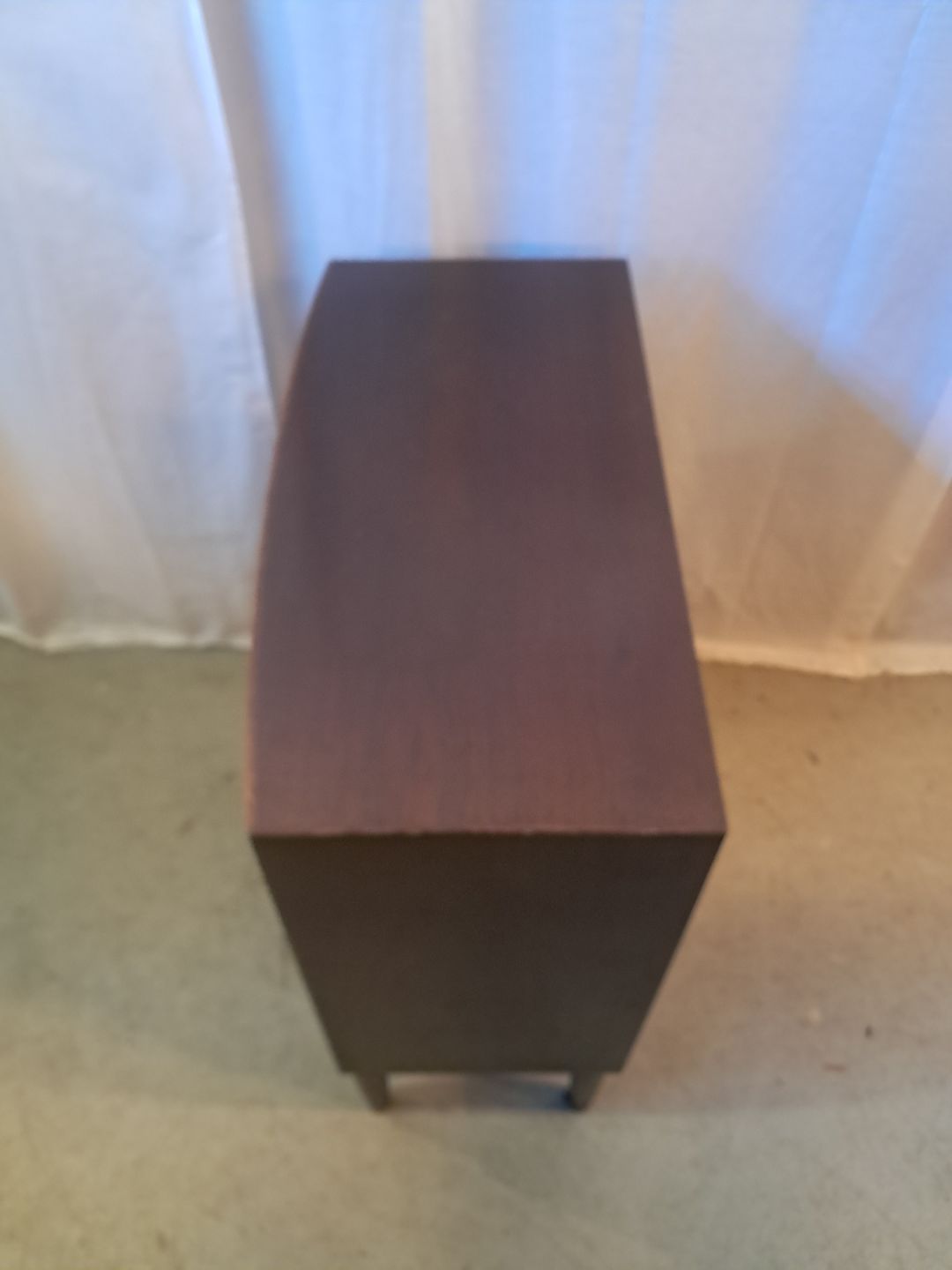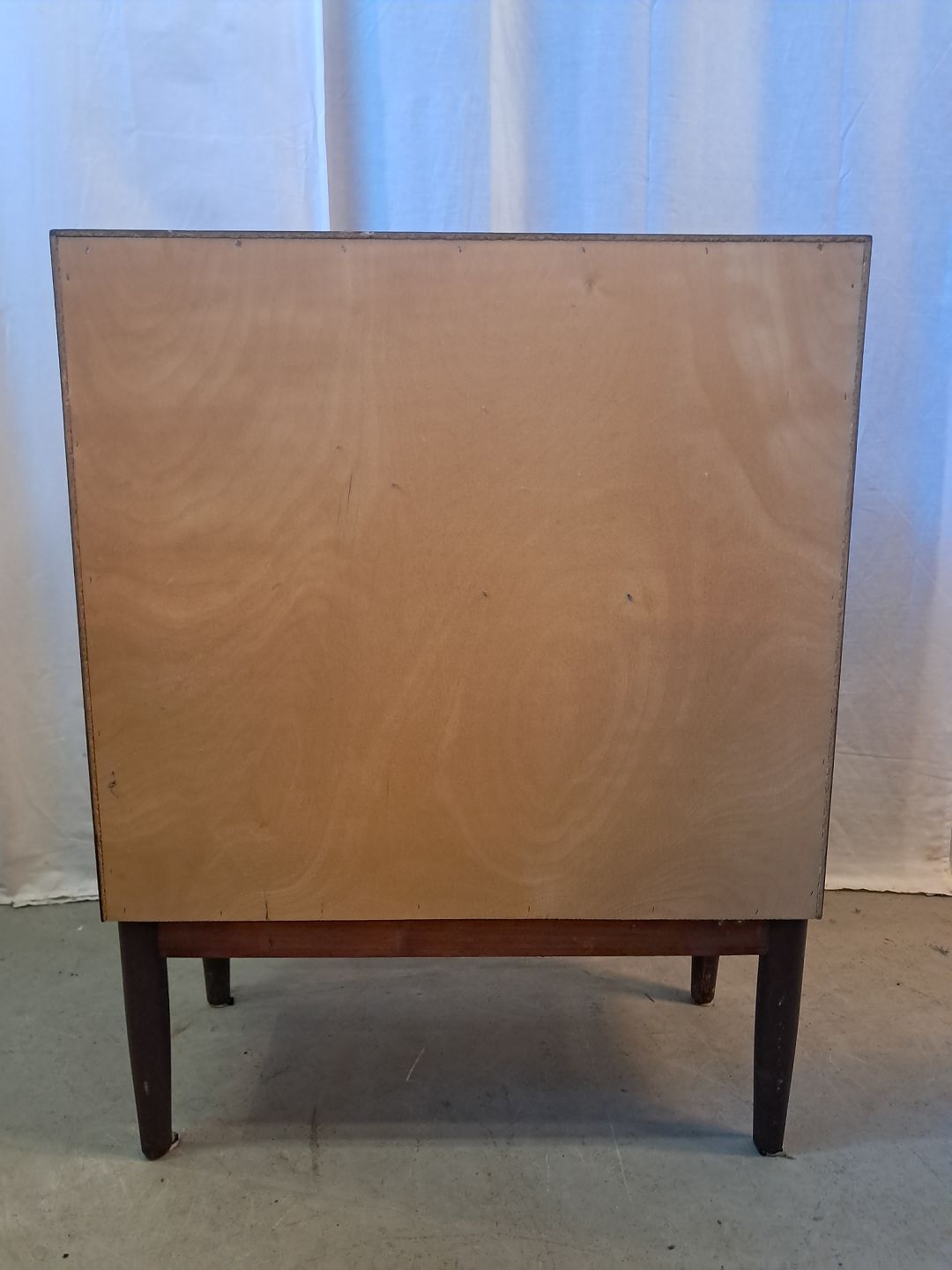 Kommode i bejdset fineret rgrtræ, fra 1960erne. Den har brugsspor og en fineret defekt. Højde 77cm Bredde 60cm Dybde 31cm Emne nummer: 77862